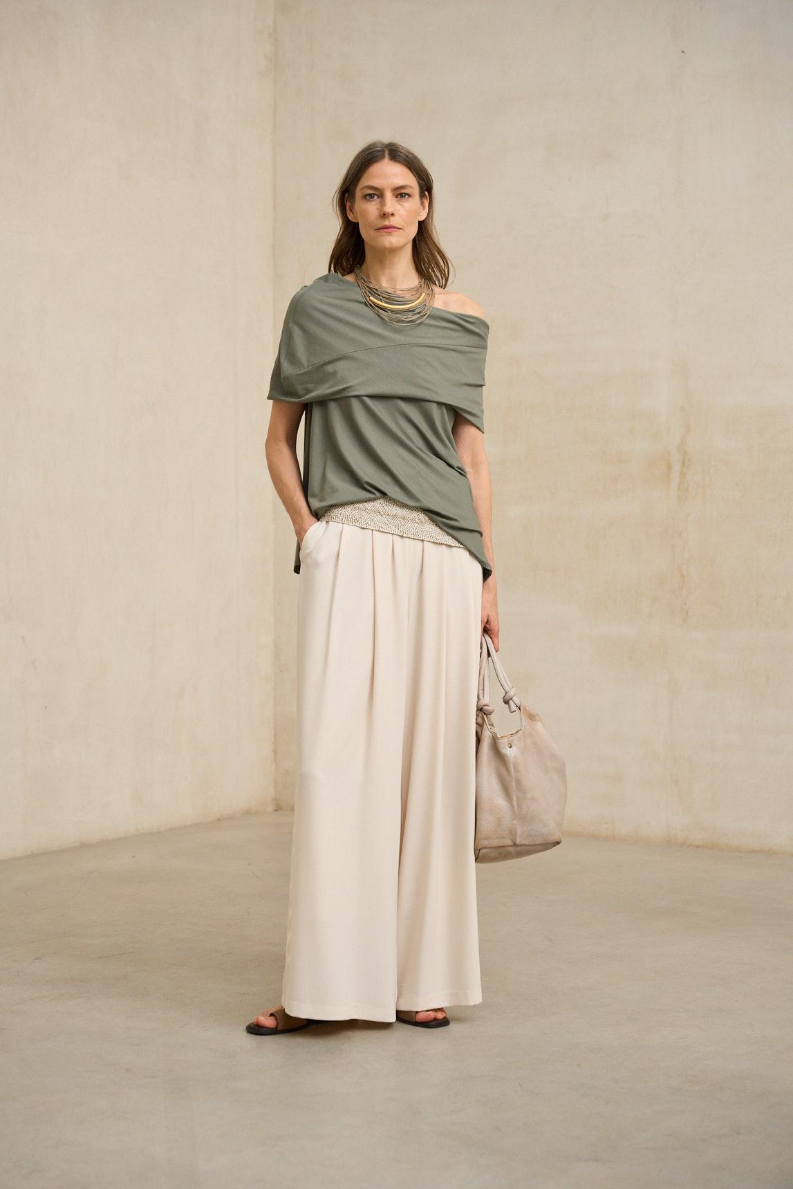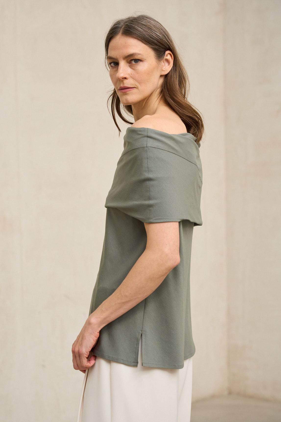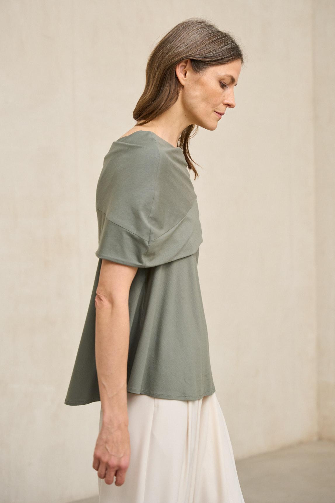 The khaki Oryen T-shirt combines a contemporary design with a fluid and modern silhouette. It features a wide boat neckline with an overlapping band that creates a structured effect on the upper part, providing controlled volume and a distinctive finish.