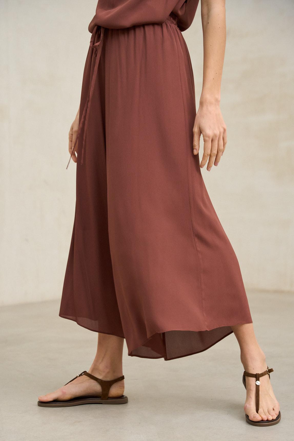 Long skirt made from a flowing fabric with a light drape and natural movement. It features a clean waistband with a comfortable fit and an A-line silhouette that gently flares from the hip, creating an elegant and flattering effect. The design stands out for its subtle movement and lightweight finish, which adds dynamism to your walk. The Nareia skirt in terracotta adds warmth and sophistication to any look. Its deep earth tone is ideal for pairing with off-whites, ecru, and sandy shades, but it truly shines when worn with the Tamara blouse, creating a balanced and harmonious coordinated ensemble. The fabric's fluidity softens the intensity of the color, resulting in a feminine, versatile, and timeless garment. Perfect for spring and summer, it can be worn with flat sandals for a natural look or with more structured shoes for a more refined result. A skirt designed to provide effortless movement, comfort, and presence. We strive to display colors as accurately as possible, but they may vary slightly from reality.