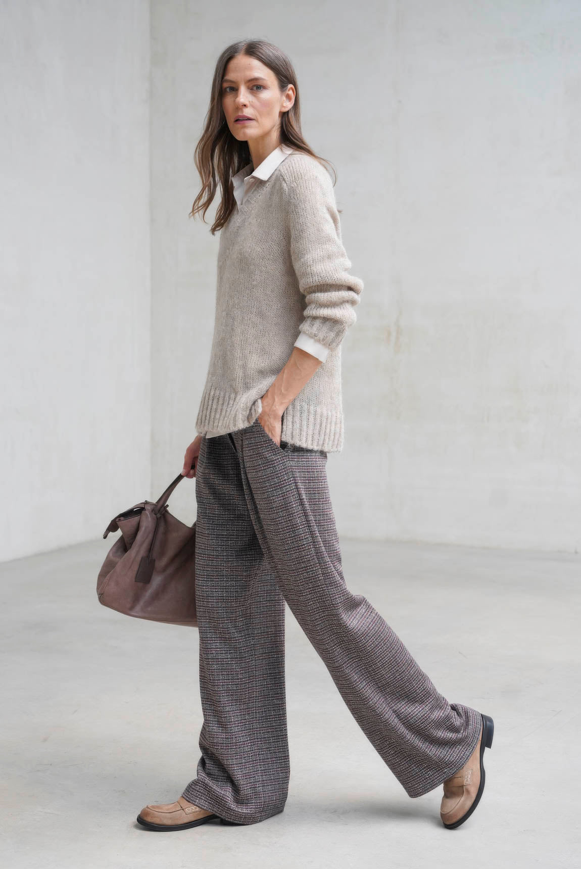 Discover the relaxed elegance of Rivera's Cuccio pants. Crafted from a warm, fluid fabric with a subtle checkered print, these pants combine comfort and style in a straight-cut silhouette that visually elongates the figure. Front pleats and belt loops at the waist add structure, while their soft drape makes them a sophisticated and functional option for everyday wear or more polished looks.