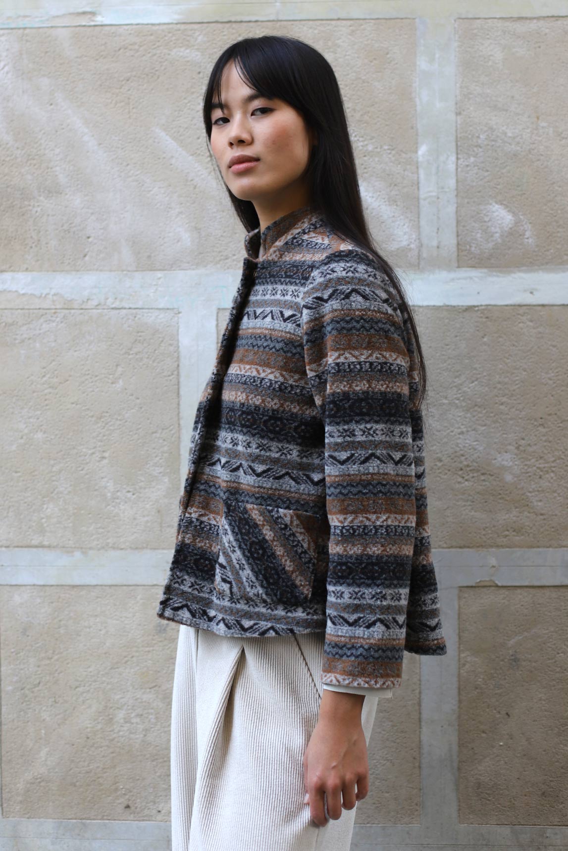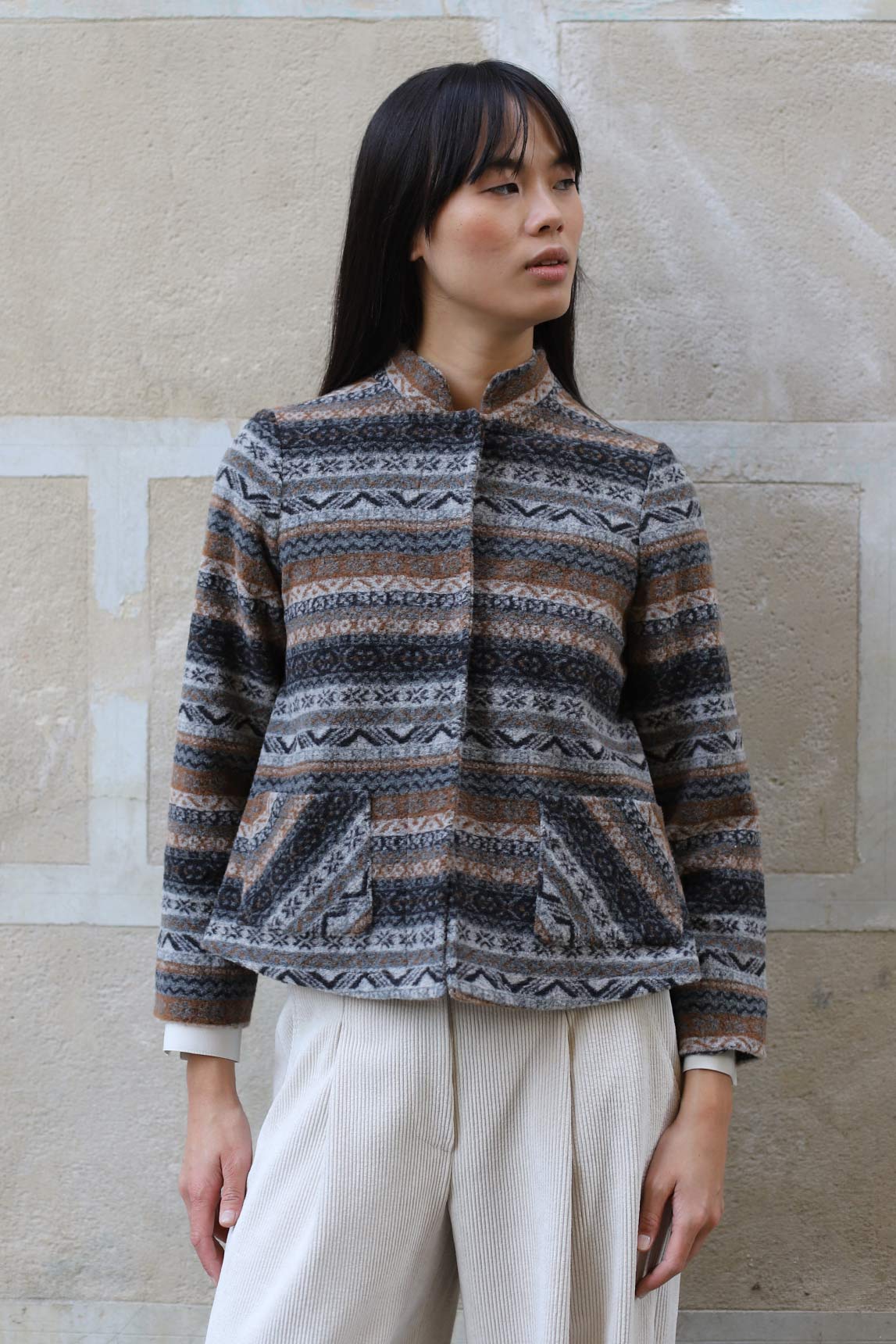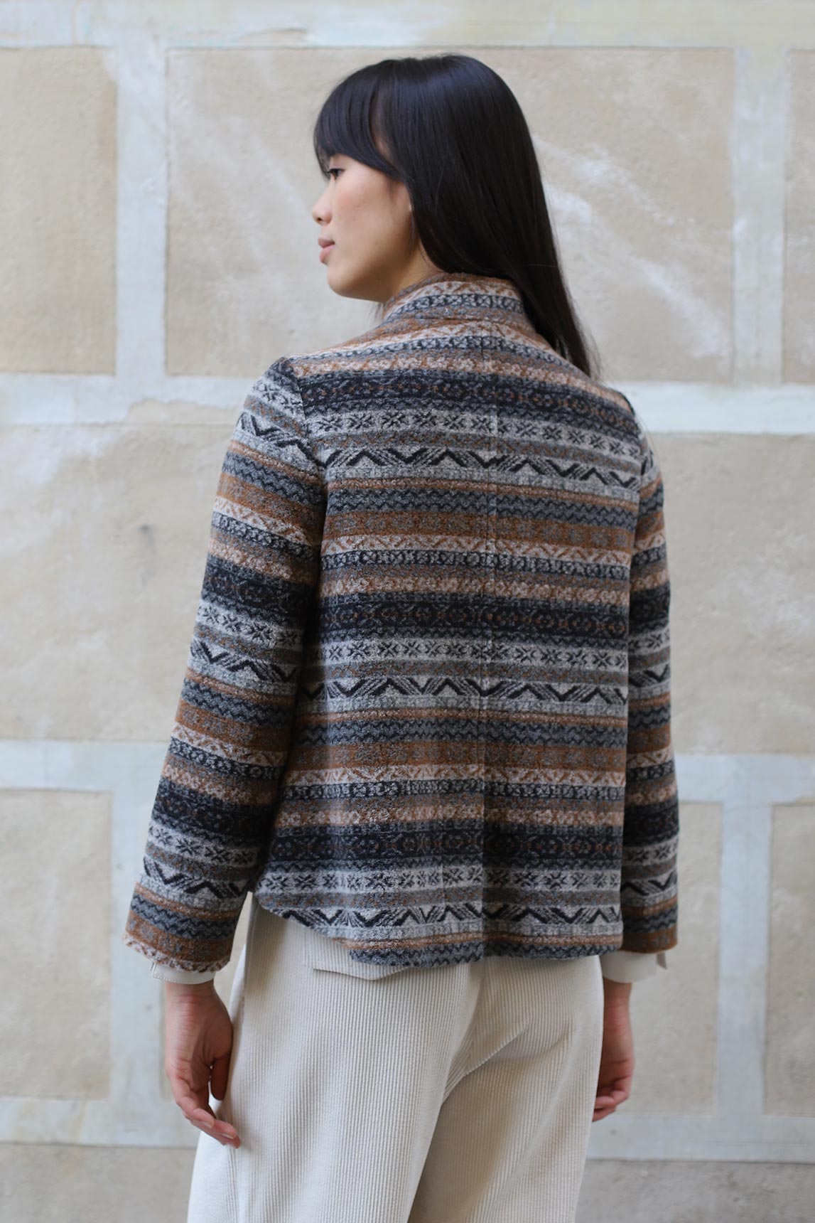 La cazadora Urbino tonos grises destaca por su combinación de colores y su tejido suave. Su diseño estructurado con cuello mao aporta un aire elegante, mientras que el estampado geométrico añade un toque bohemio y contemporáneo. Perfecta para dar protagonismo a looks neutros o para jugar con superposiciones en otoño e invierno.
