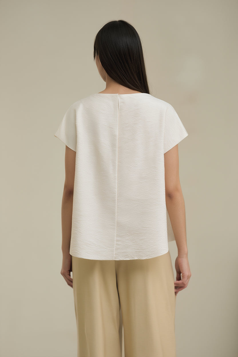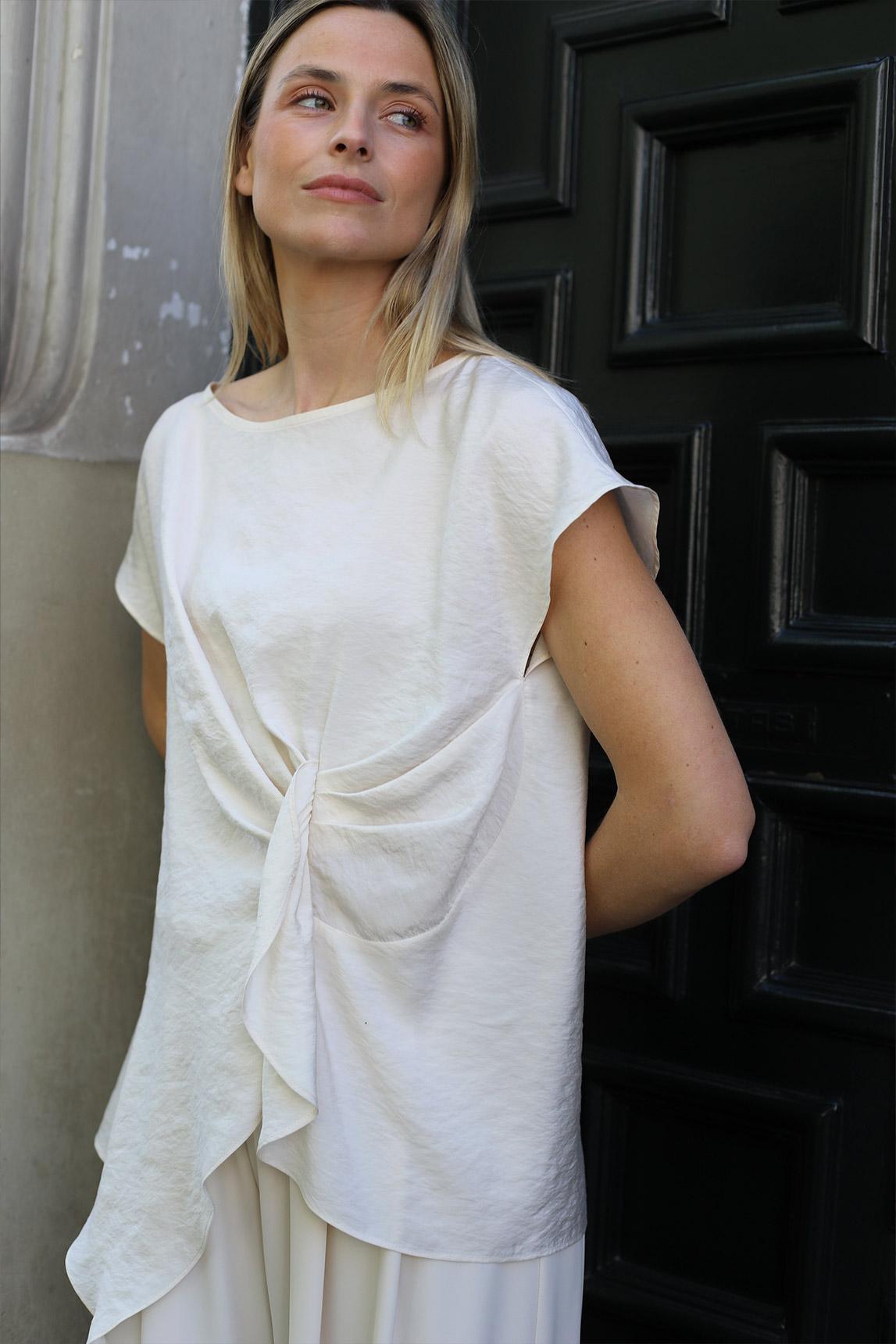 Blusa de mujer en color crudo con escote redondo, manga corta caída y silueta fluida. El diseño destaca por su drapeado lateral con efecto nudo, que recoge el tejido de forma suave y crea una caída asimétrica en el bajo, aportando movimiento y una línea envolvente muy favorecedora. La superficie presenta un acabado liso con ligera textura visual, reforzando una imagen limpia, elegante y actual.