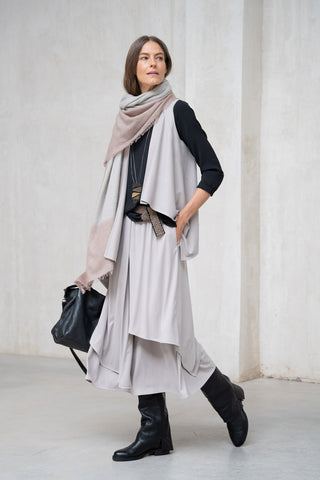 - Diseño asimétrico con doble capa y ligera caída fluida.