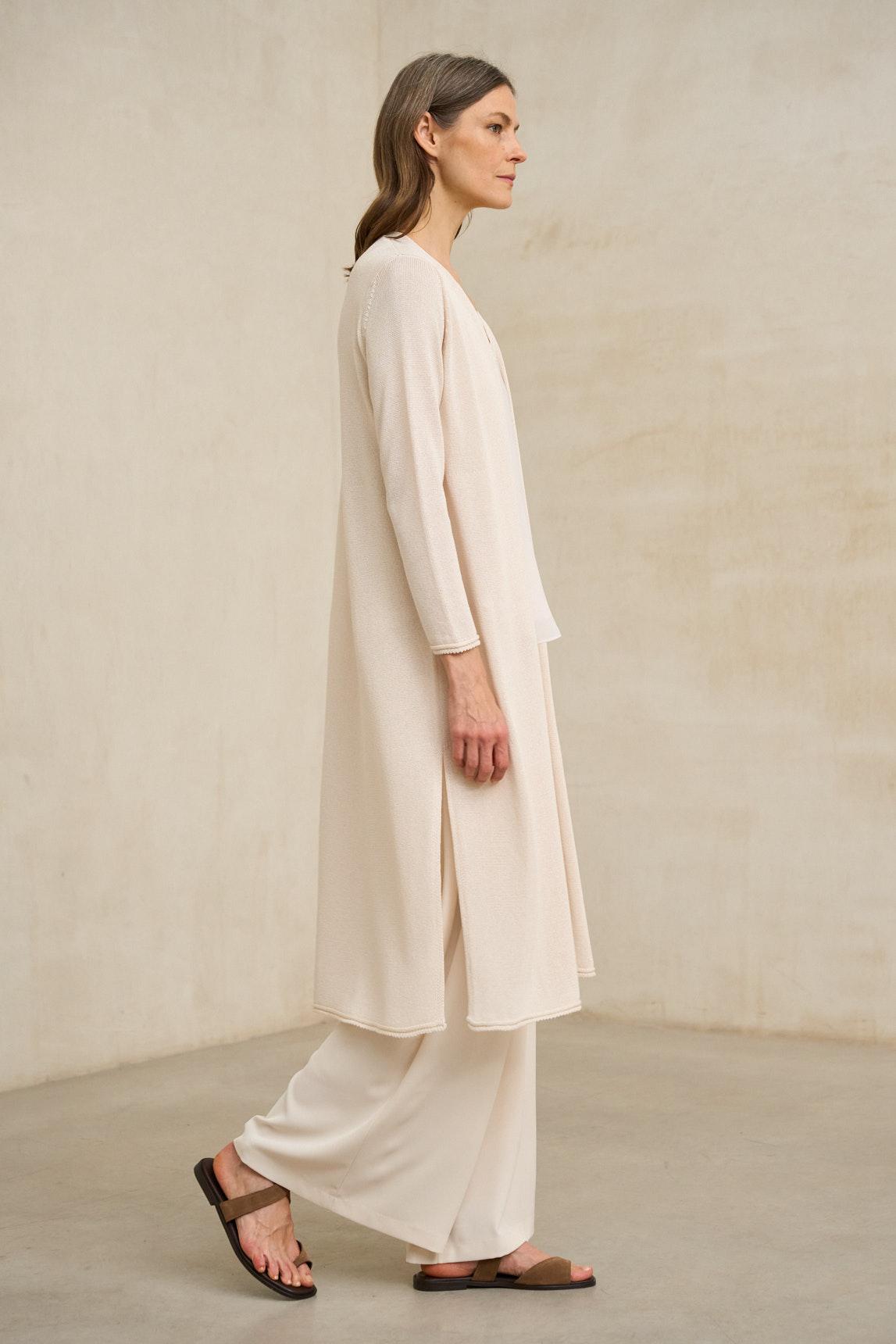 La chaqueta de punto Avelin crudo es una prenda larga y fluida diseñada para aportar ligereza y sofisticación a los estilismos de entretiempo. Su silueta abierta, sin cierre, cae con naturalidad desde los hombros, creando una línea vertical que estiliza y alarga visualmente la figura. Confeccionada en tejido de punto suave y ligero, presenta manga larga y un bajo ligeramente evasé que aporta movimiento al caminar. El tono crudo, luminoso y atemporal, refuerza su versatilidad dentro de una paleta neutra, combinando fácilmente con arena, camel, verde oliva o gris antracita. Ideal para superponer sobre conjuntos monocromáticos, pantalones fluidos o vestidos ligeros, la chaqueta de punto Avelin crudo funciona como capa ligera que estructura el look sin añadir peso. Una pieza elegante y atemporal pensada para acompañar tanto estilismos de día como propuestas más cuidadas. Nos esforzamos por mostrar los colores de la forma más fiel posible, pero pueden variar ligeramente respecto a la realidad.