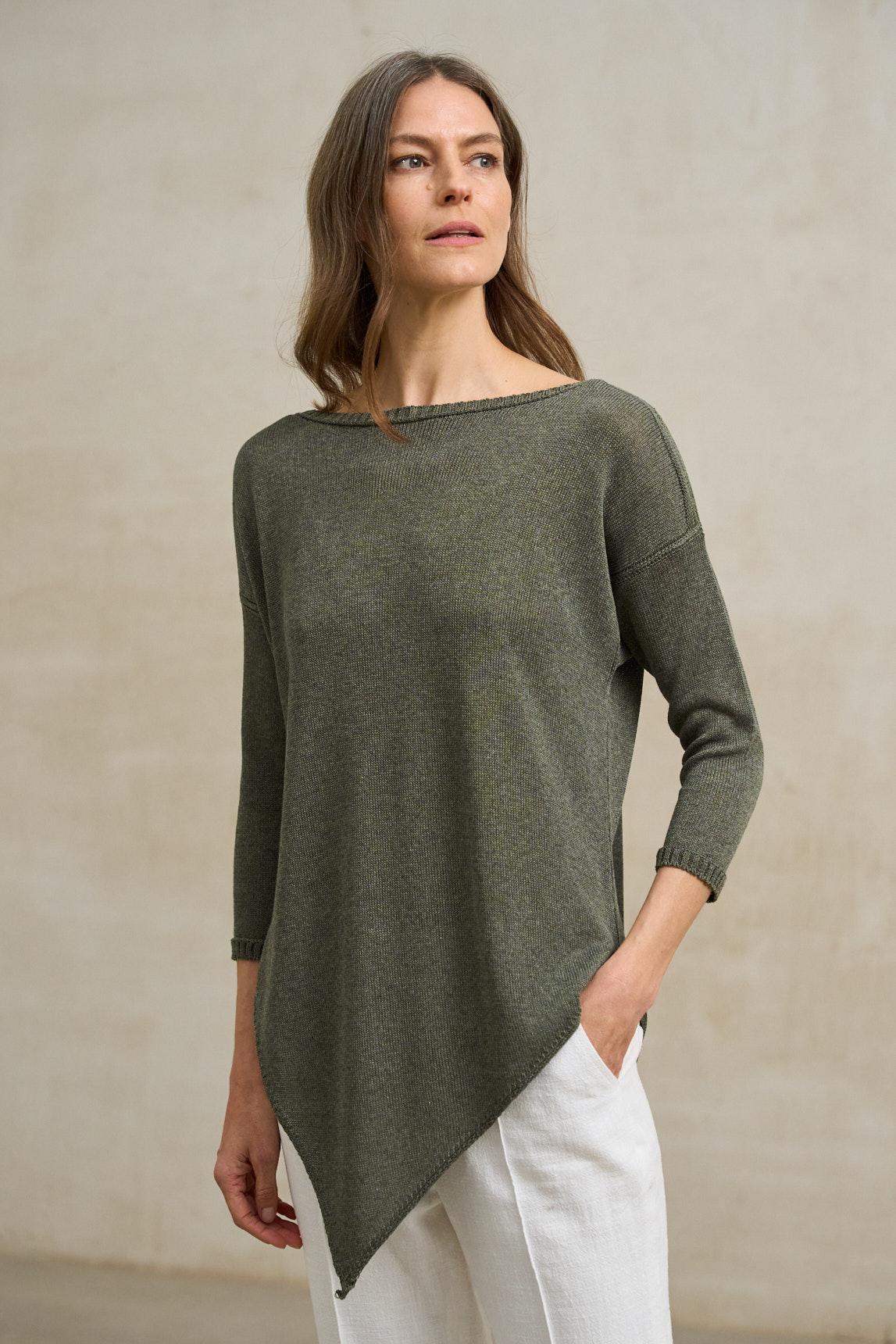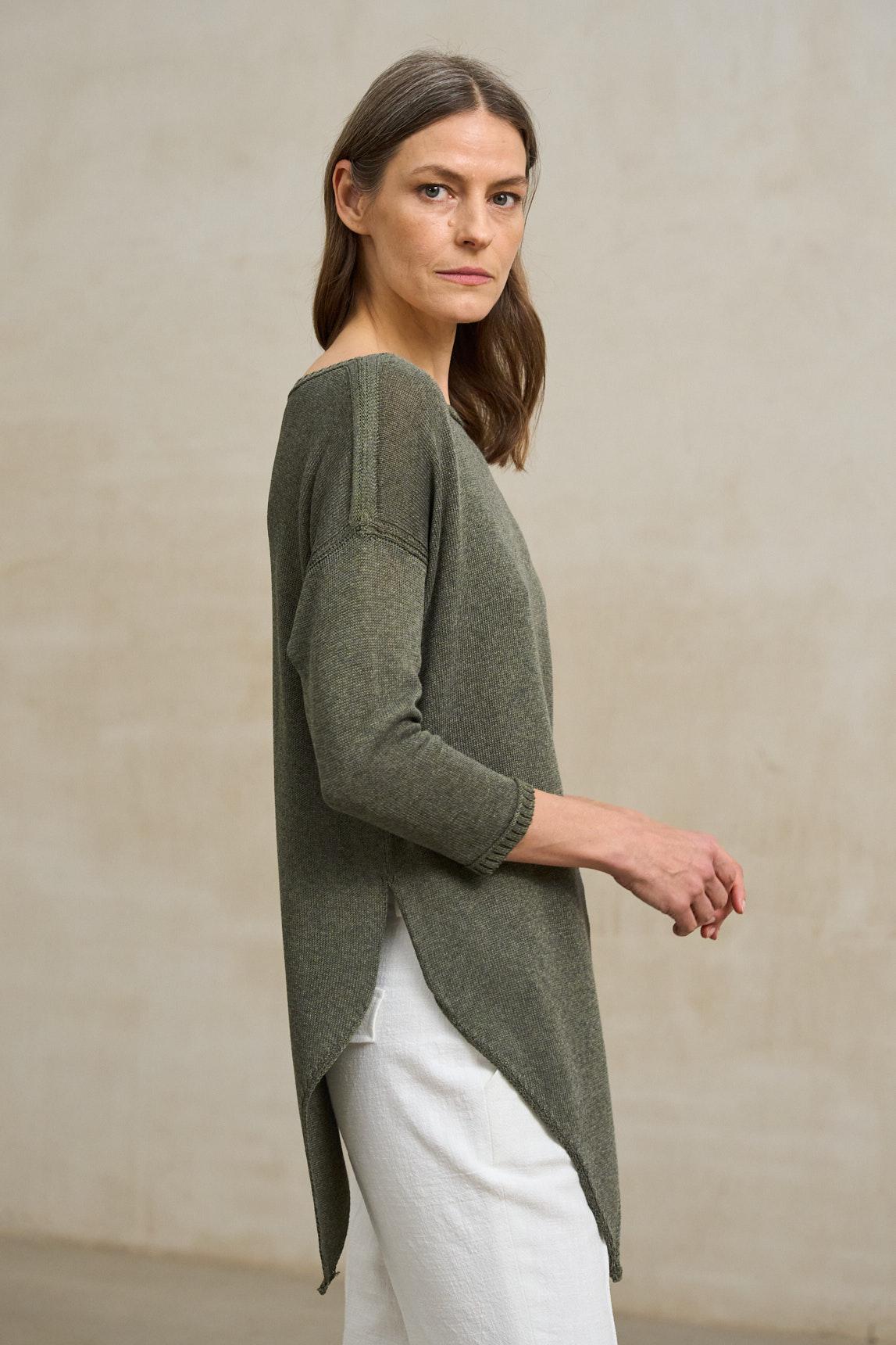 El tono verde musgo aporta profundidad y carácter natural, combinando especialmente bien con blancos rotos, crudos, beige o tonos tierra. Una pieza versátil y atemporal que encaja tanto en estilismos relajados de diario como en conjuntos más cuidados con pantalones fluidos o faldas midi.
