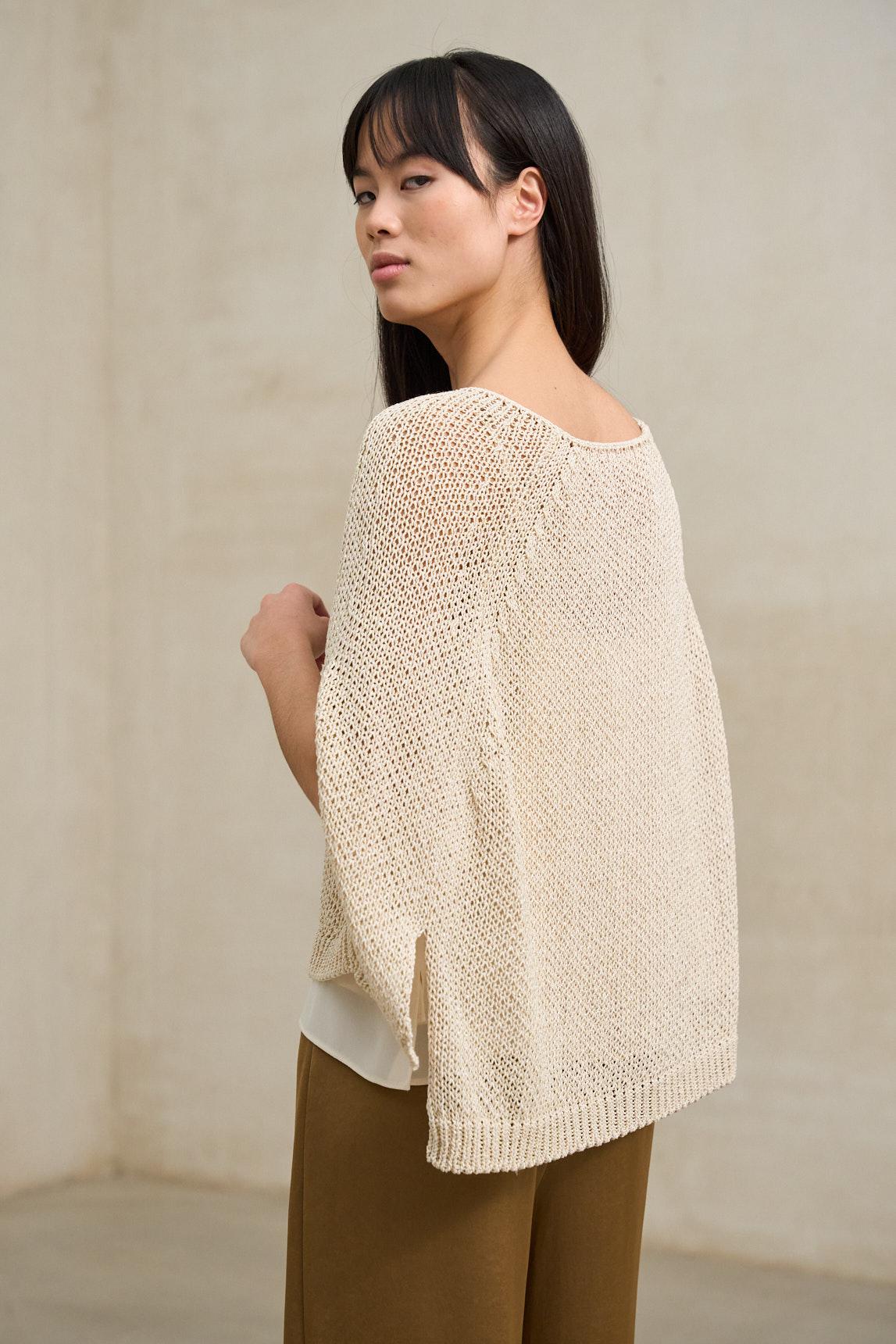 El jersey Calero en color beige destaca por su diseño relajado y contemporáneo, ideal para crear looks elegantes y naturales. Confeccionado en punto ligero de textura abierta, aporta una sensación fresca y cómoda, perfecta para los meses de entretiempo o verano.