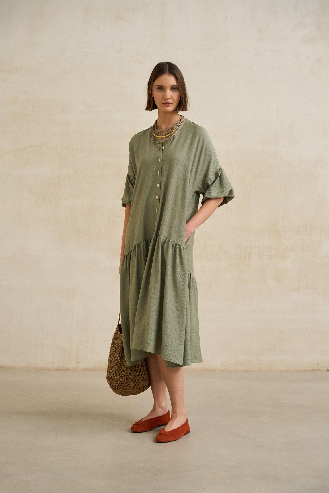 El Vestido Arisse verde salvia combina estructura suave y elegancia relajada en una silueta femenina y fluida. Confeccionado en tejido ligero de tacto natural, presenta cuello camisero, botonadura frontal completa y manga corta ligeramente estructurada.
