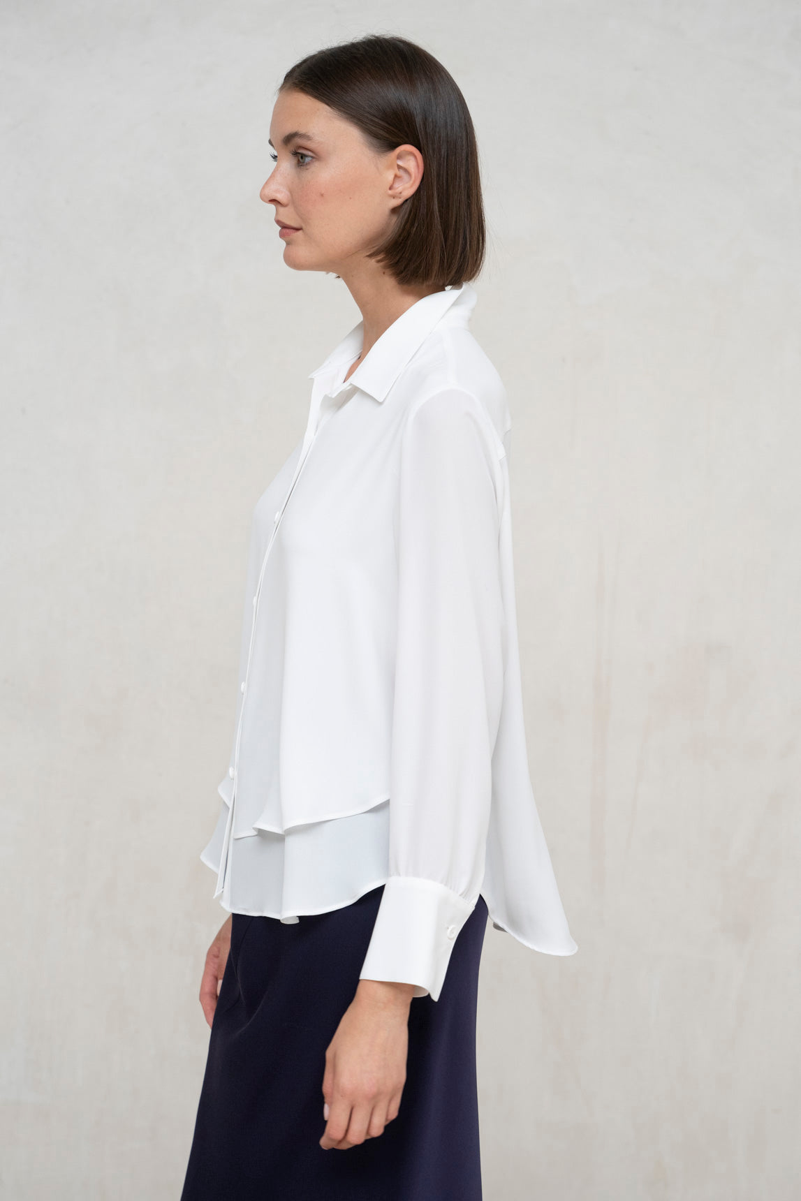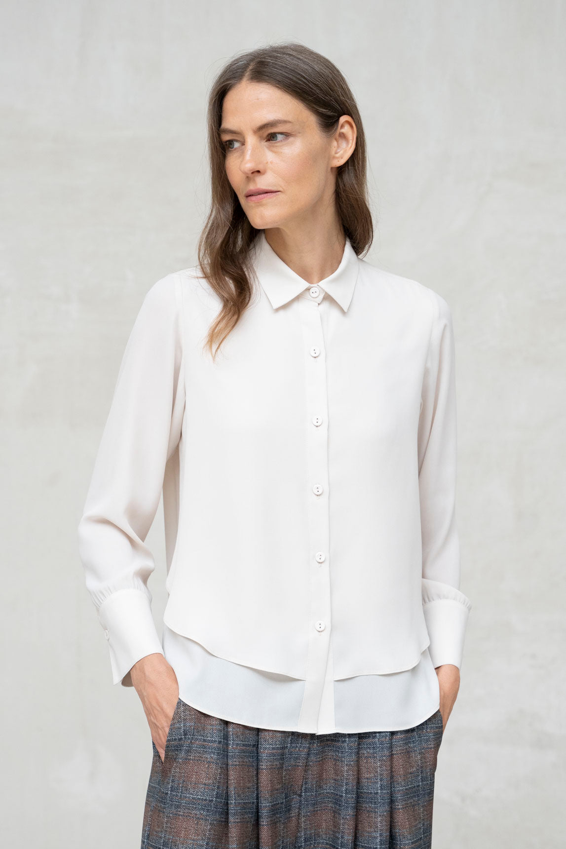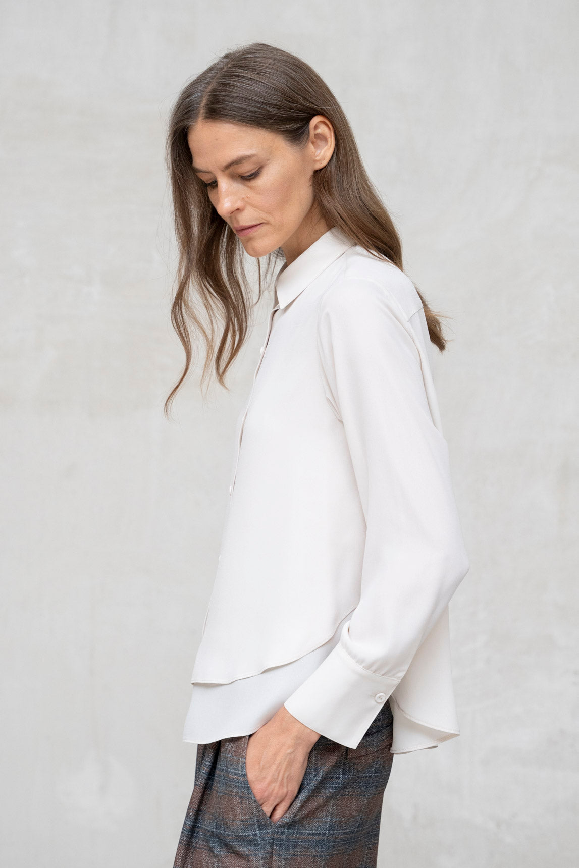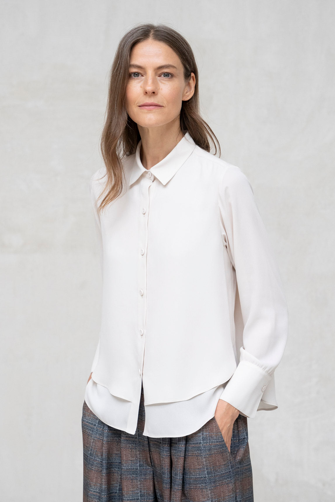 La blusa Como color crudo es una pieza versátil y sofisticada. Su bajo doble añade interés visual sin recargar, y el tejido fluido la hace perfecta tanto para looks de oficina como para estilismos casual chic con vaqueros o faldas.