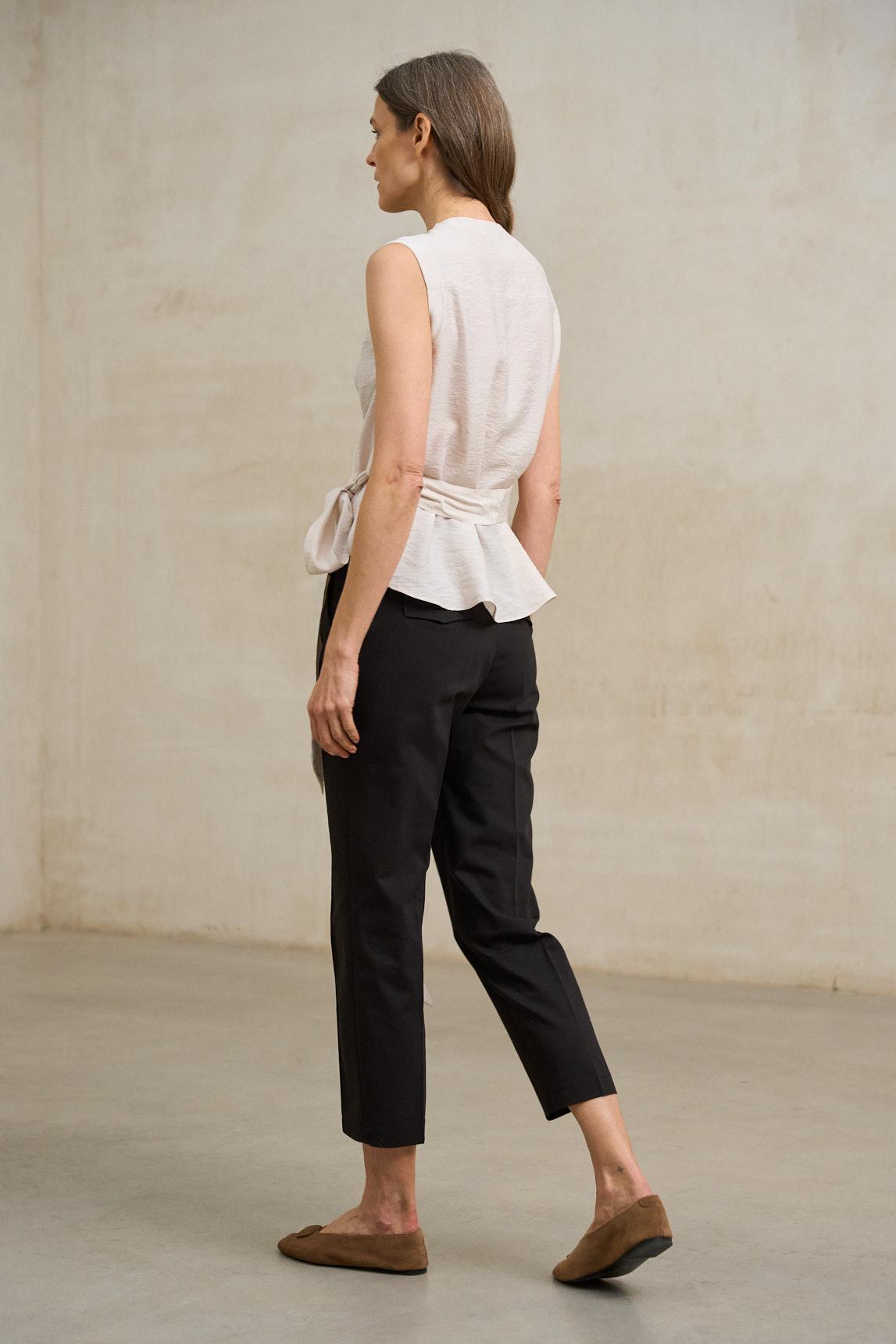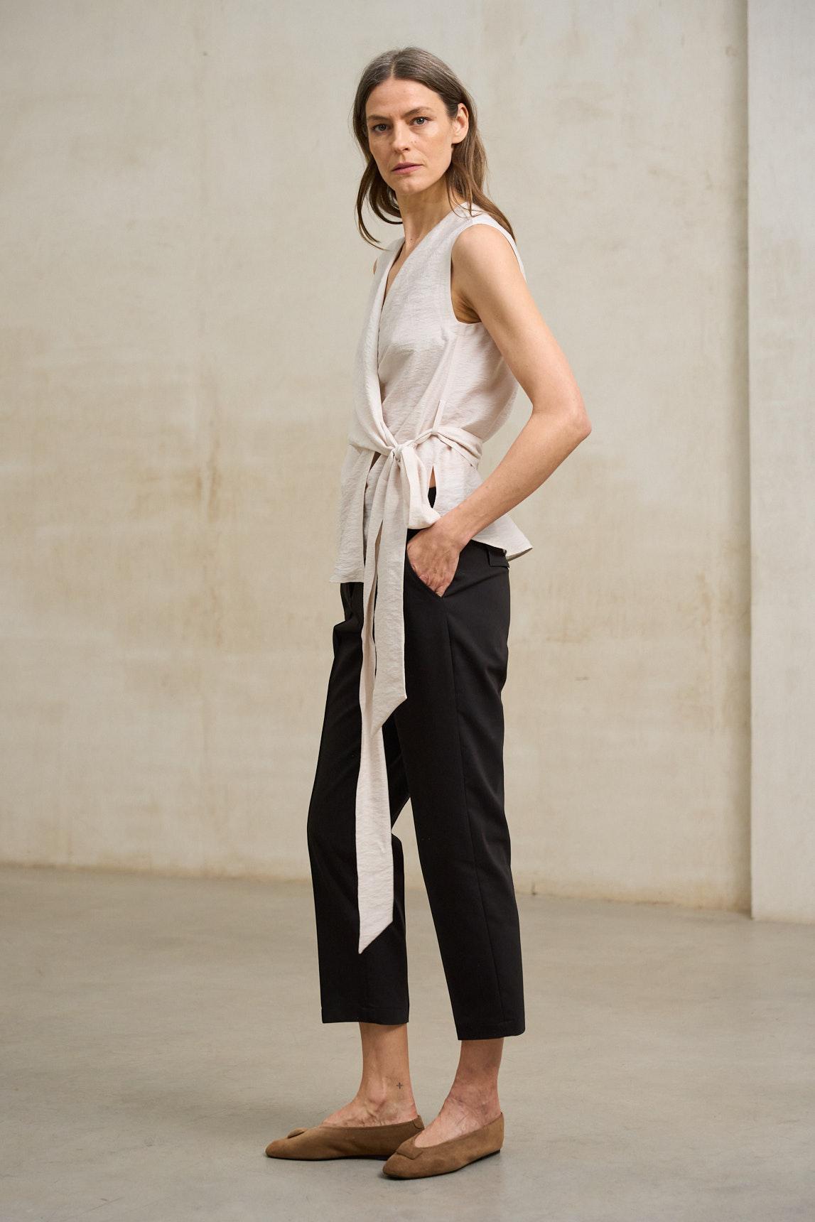 La Camisa Zarev crudo destaca por su diseño cruzado con lazada lateral que define la silueta de forma natural y favorecedora. Confeccionada en tejido ligero de caída fluida, presenta escote en pico y diseño sin mangas que estiliza visualmente el torso. La lazada permite ajustar el cruce generando un efecto sutilmente drapeado que aporta movimiento sin ceñir en exceso. El tono crudo, más cálido que el blanco óptico, suaviza el conjunto y facilita combinaciones con beige, camel, verde oliva o tonos tierra. Una prenda contemporánea que equilibra estructura y fluidez con un acabado luminoso y sofisticado. Nos esforzamos por mostrar los colores de la forma más fiel posible, pero pueden variar ligeramente respecto a la realidad.