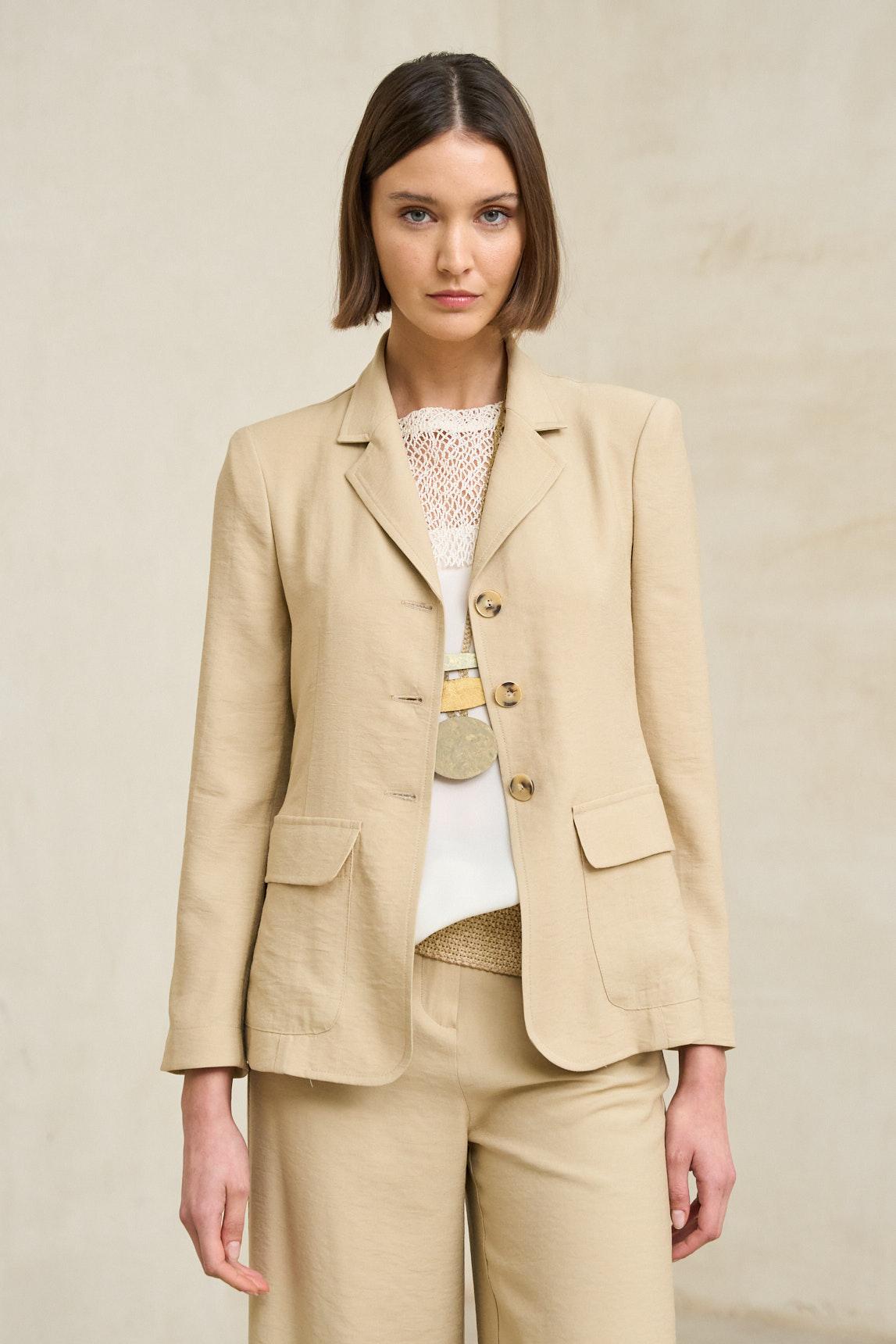 Chaqueta de mujer confeccionada en tejido ligero de tacto suave y estructura fluida. Presenta cuello solapa, cierre frontal con botones al tono y bolsillos de plastrón que aportan equilibrio entre funcionalidad y diseño. La manga larga y el corte recto crean una silueta limpia y favorecedora, ideal para estilismos relajados y elegantes.
