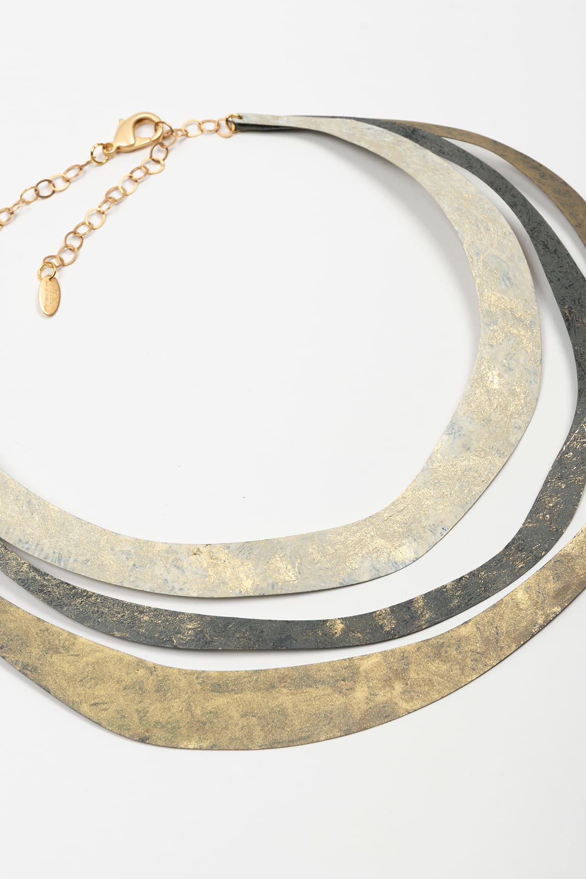 Collar tipo gargantilla con láminas anchas curvadas en capas, formando tres arcos escalonados que enmarcan el cuello con un acabado metalizado de efecto texturizado. Se cierra con mosquetón y cadena extensora, lo que permite ajustar la altura para adaptarlo a distintos escotes y conseguir una caída más pegada o ligeramente suelta.