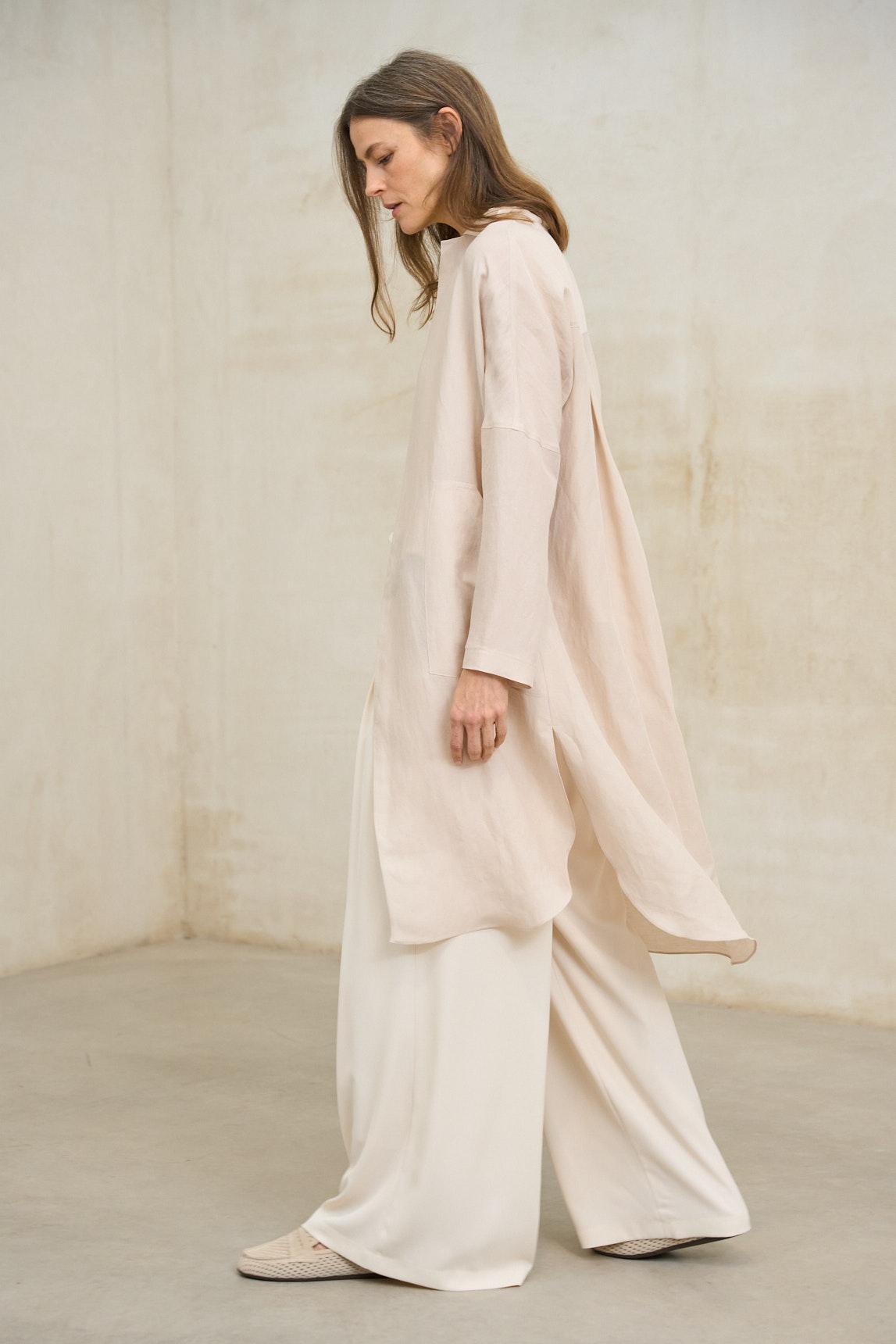 La levita Lirael crudo empolvado es una prenda ligera de líneas limpias y caída fluida, pensada para completar estilismos elegantes con un aire sofisticado y minimalista. Su diseño abierto, sin cierre visible, permite que el tejido acompañe el movimiento con naturalidad.