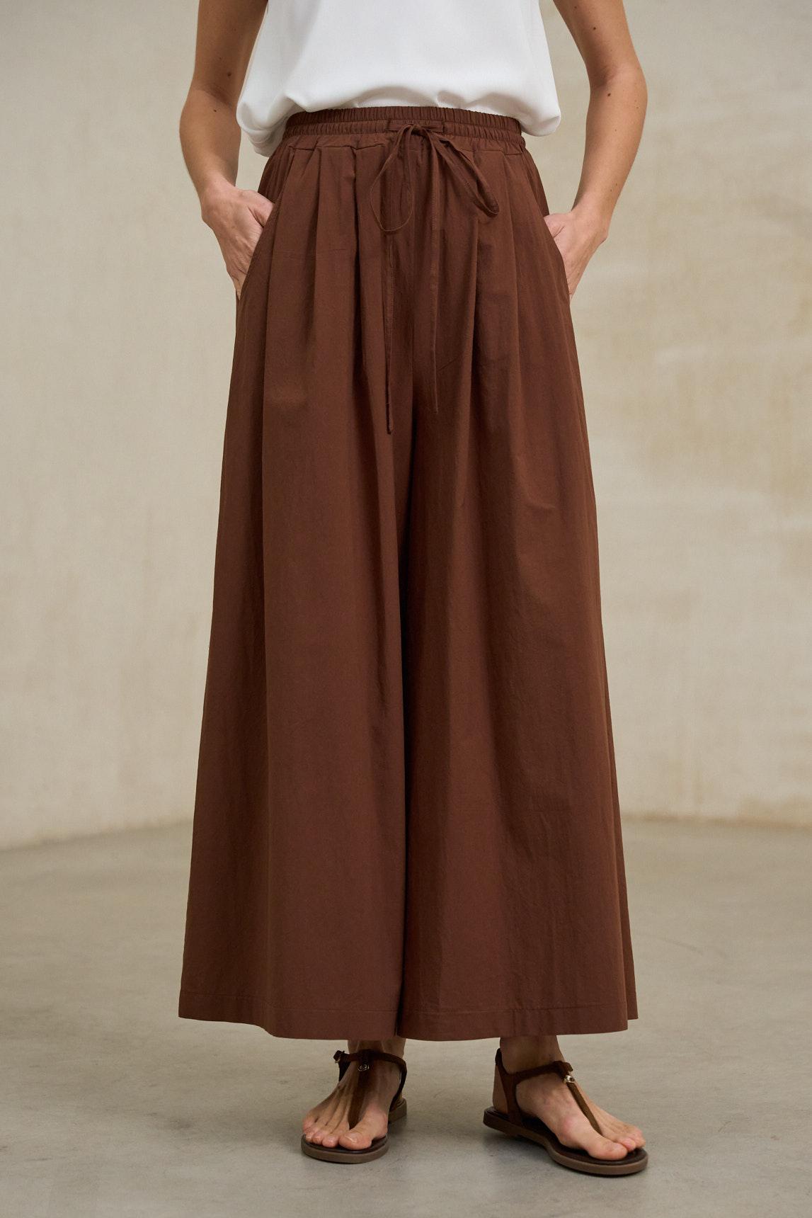 Pantalón de mujer confeccionado en tejido ligero y fluido que aporta una caída suave y natural. Presenta cintura elástica fruncida con cordón ajustable, ofreciendo comodidad y adaptabilidad al cuerpo. Incorpora bolsillos laterales discretos y pernera ancha con pliegues verticales que estilizan la silueta y acompañan el movimiento.