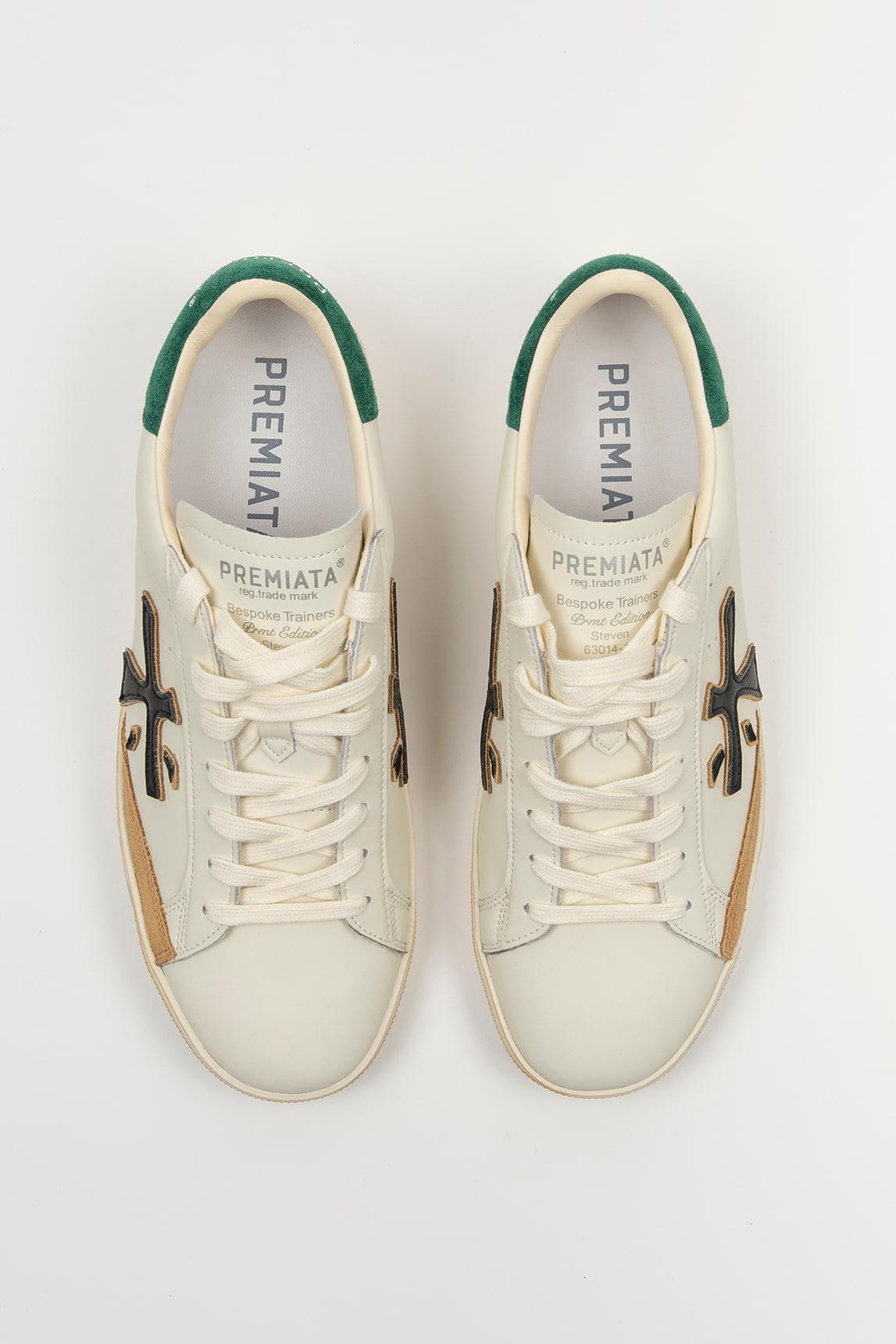 El tono crudo se complementa con detalles en verde y negro, creando un contraste elegante que aporta personalidad sin perder versatilidad. El logotipo lateral y la suela con los gráficos característicos de Premiata refuerzan la identidad de la marca, mientras que su construcción garantiza comodidad y estabilidad para el uso diario.