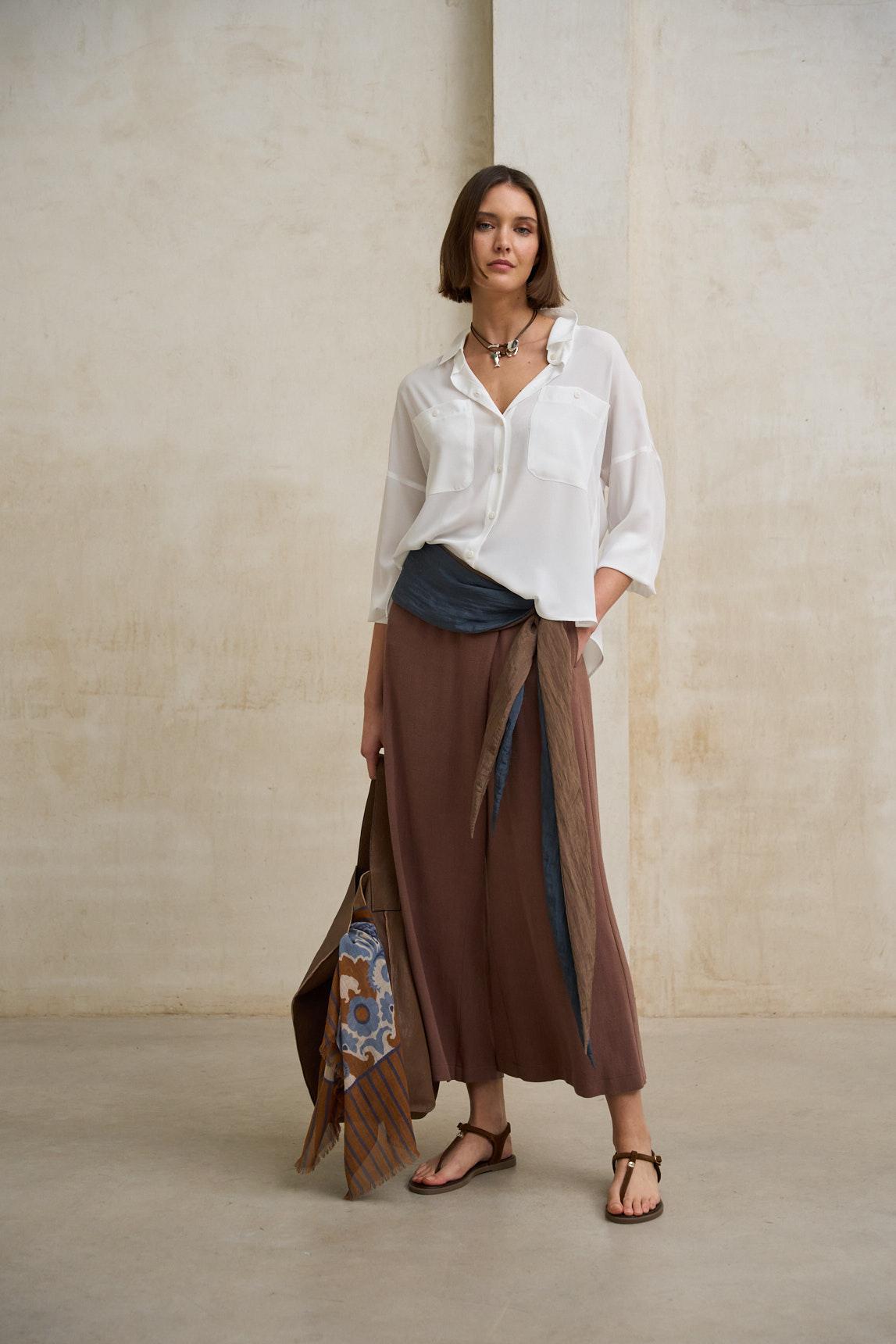 La Camisa Arlen blanco combina la pureza del blanco con una silueta fluida y contemporánea. Confeccionada en tejido ligero y agradable al tacto, presenta cuello camisero, botonadura frontal y manga larga con puño sencillo.