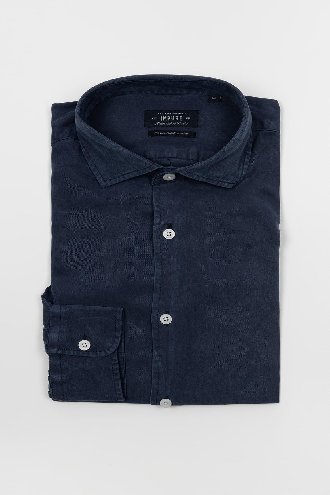 Camisa de hombre de manga larga en azul marino, con silueta recta y una superficie de textura arrugada que aporta un aspecto natural y desenfadado. El diseño incorpora cuello clásico, cierre frontal de botones al tono y puños abotonados, manteniendo una imagen limpia con un punto de carácter. La caída se percibe cómoda y ligera, mientras el relieve visible del tejido aparente añade profundidad y movimiento al conjunto.