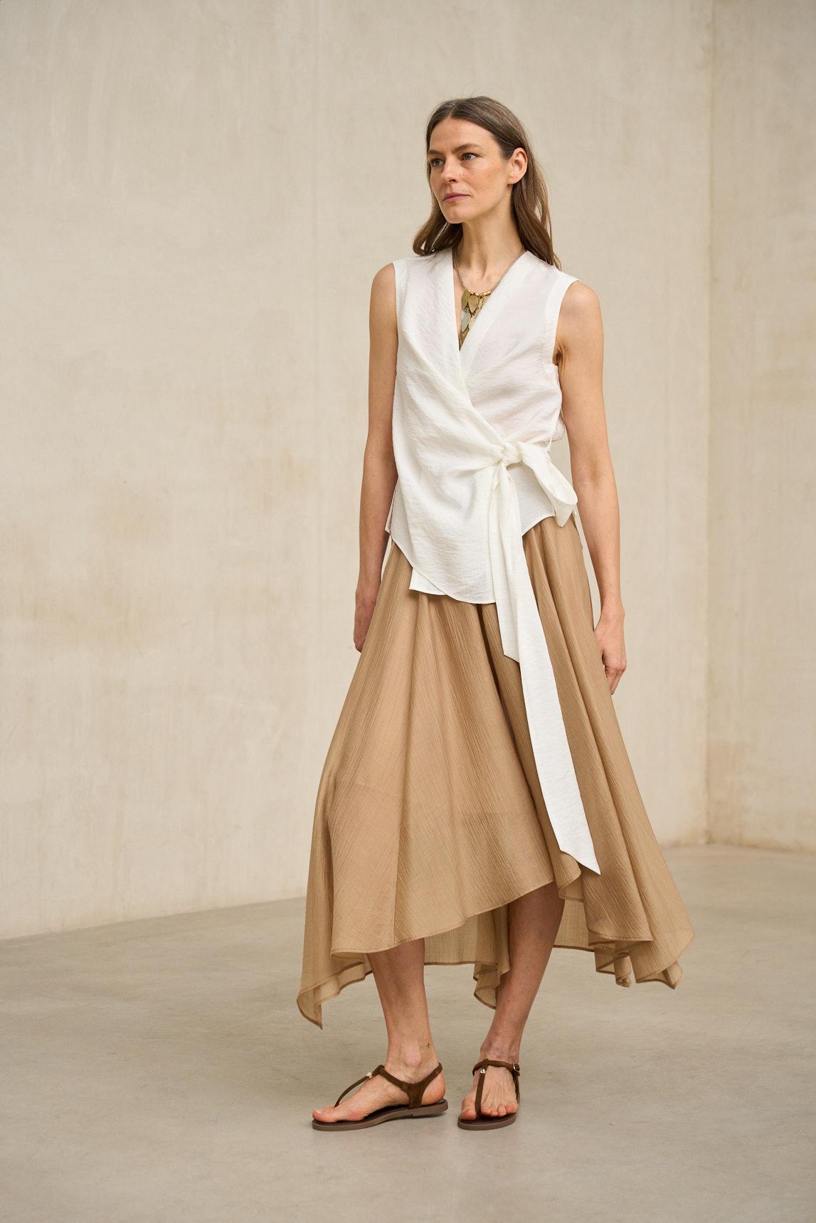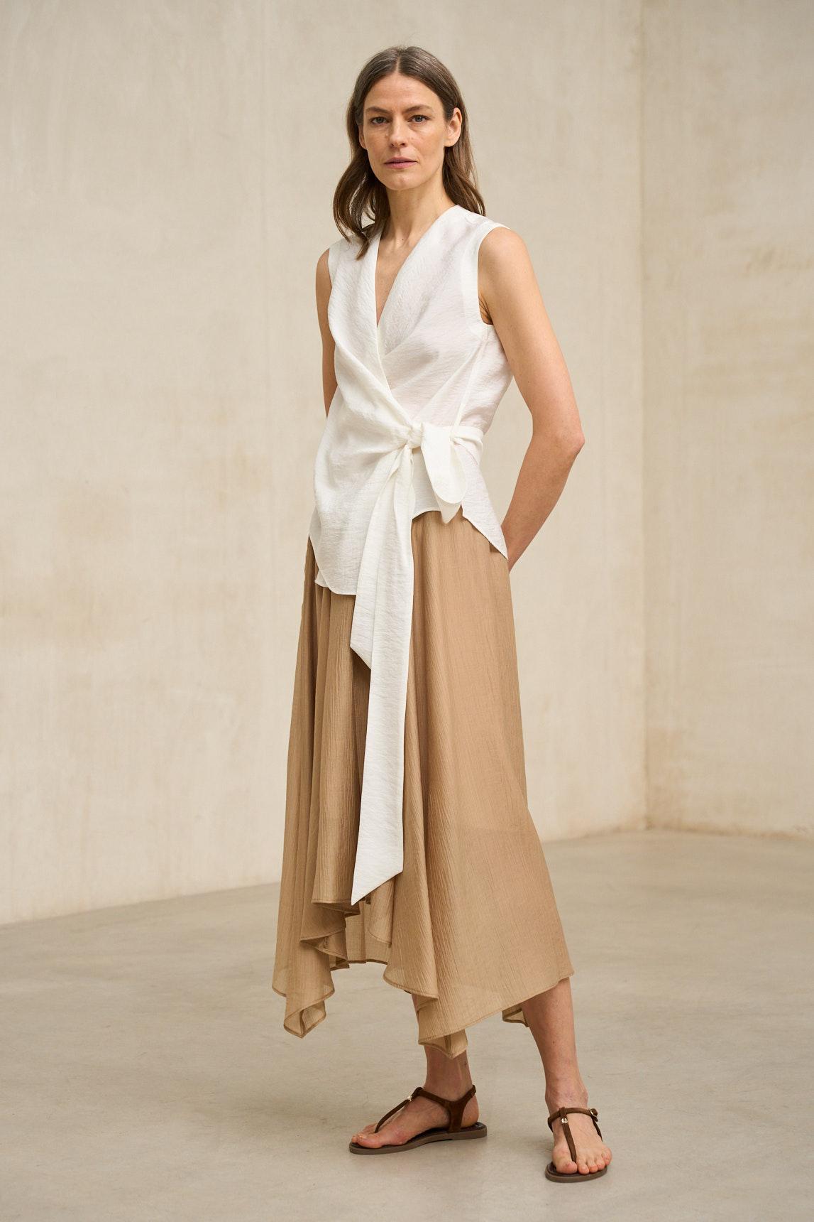 El tejido ligero acompaña el movimiento con naturalidad, manteniendo una silueta limpia y depurada. En blanco, la prenda adquiere un carácter más fresco y versátil, ideal para estilismos monocromáticos, conjuntos de verano o combinaciones con tonos oscuros que generen contraste.
