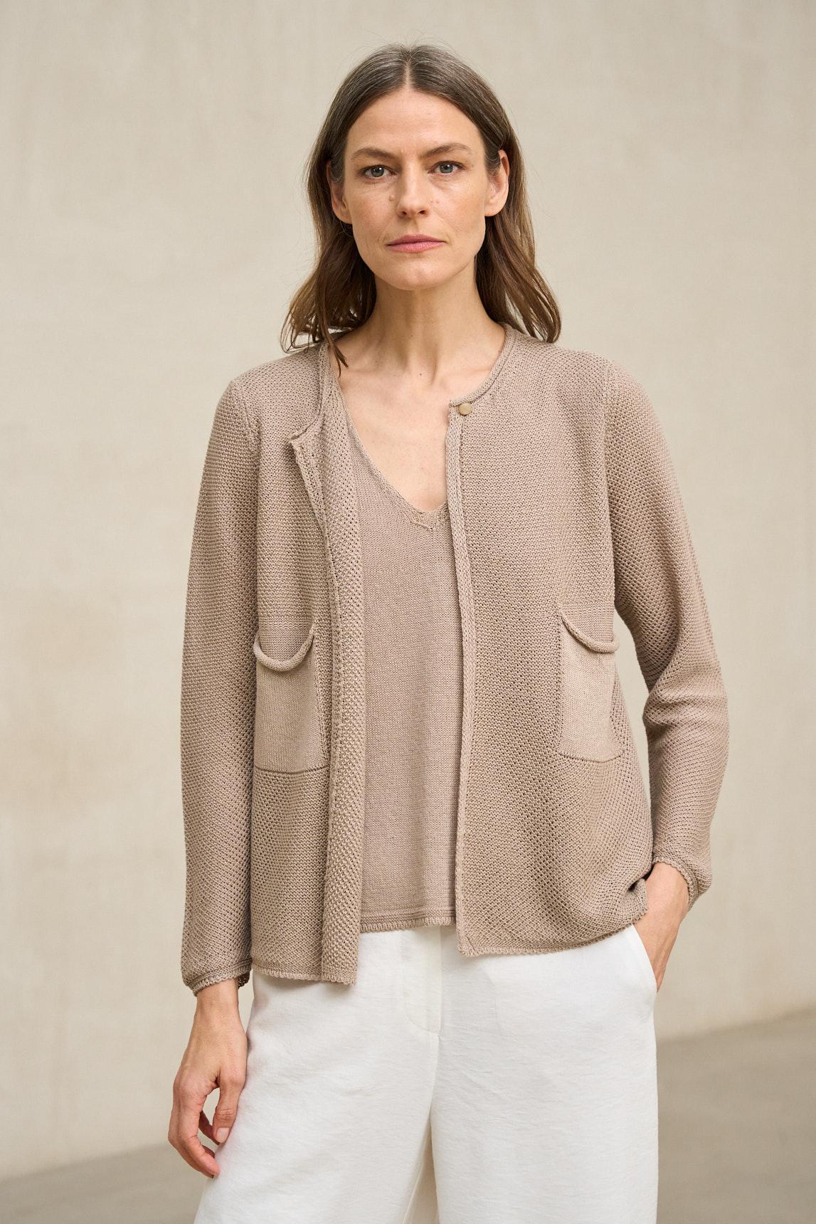 La chaqueta de punto Lierne arena tostado aporta mayor profundidad cromática dentro de la gama neutra. Su color cálido combina especialmente bien con blancos rotos, crudos y tonos tierra, funcionando como pieza central en estilismos monocromáticos o conjuntos coordinados.