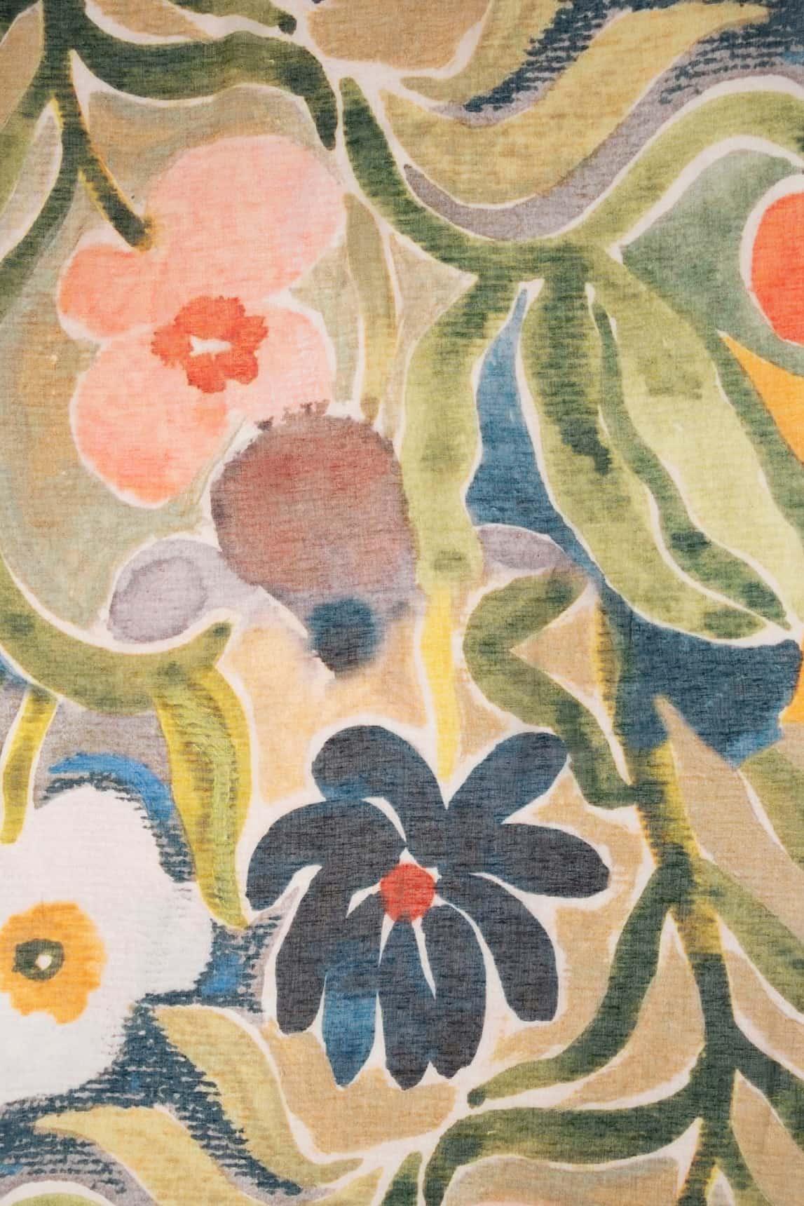 El Fular Maëra floral verde y mostaza destaca por su estampado artístico de gran formato, donde motivos orgánicos y pinceladas suaves se combinan en una paleta natural con acentos mostaza y verde oliva.