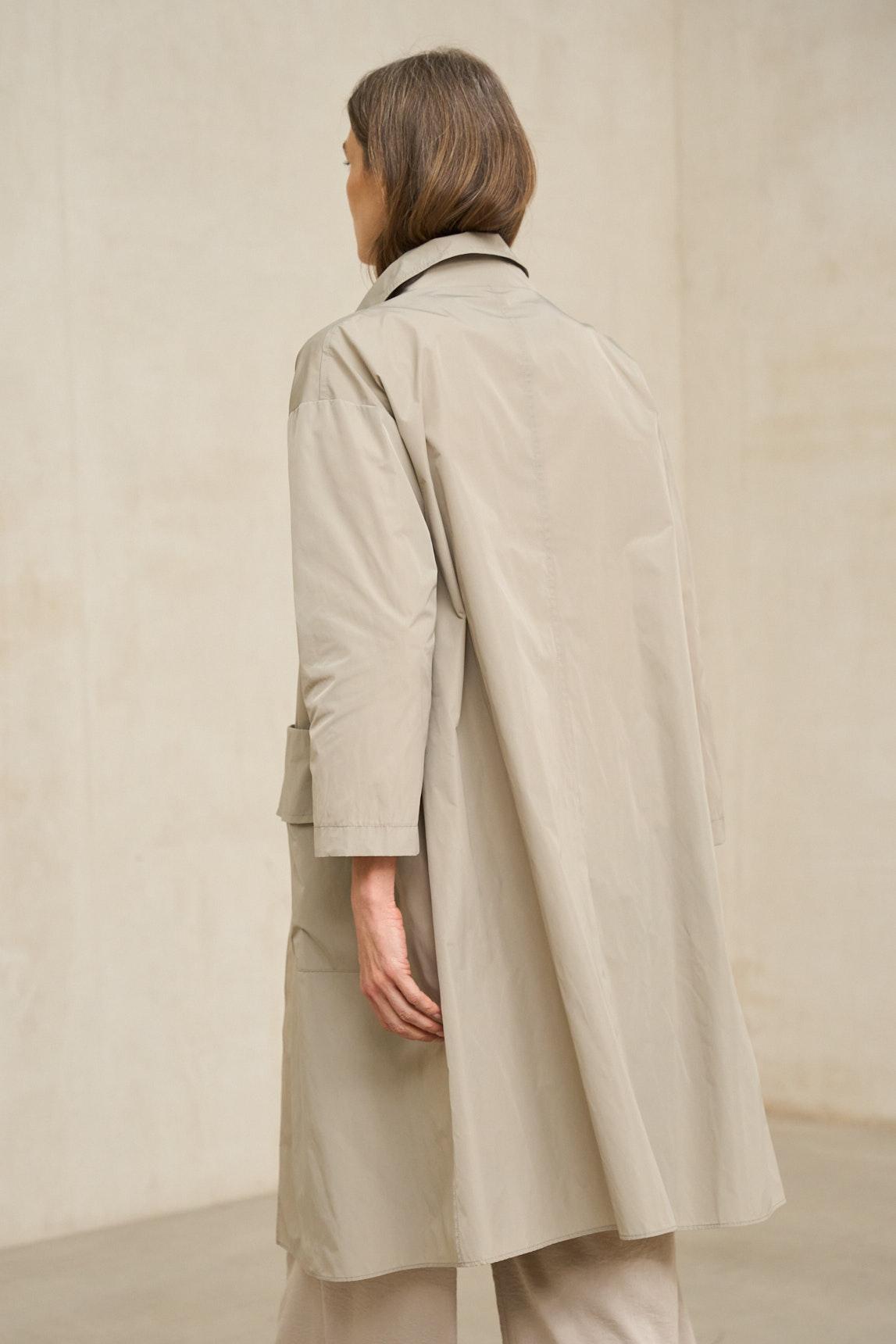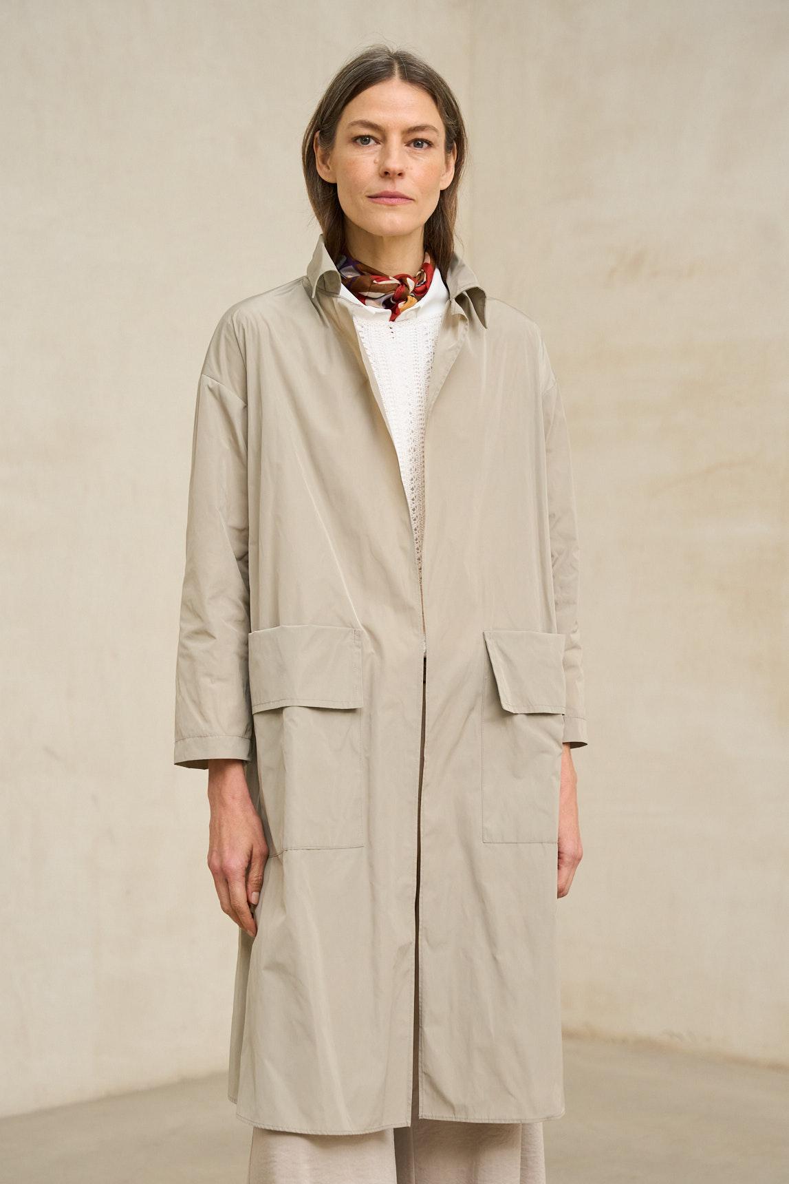 Esta gabardina ligera presenta una silueta recta y depurada, con largo midi que cae por debajo de la rodilla y estructura limpia desde los hombros. El diseño incorpora un cuello amplio y definido, mangas largas y un cierre frontal con cremallera centrada que queda integrada de forma discreta en el conjunto. En la parte delantera se aprecian bolsillos amplios y funcionales, colocados a la altura de la cadera, que refuerzan su carácter práctico sin romper la armonía visual. El tejido muestra un acabado liso con una ligera textura arrugada y un sutil brillo, aportando un aire contemporáneo y urbano. Su corte relajado permite llevarla abierta o cerrada, sobre capas ligeras o prendas más estructuradas. Funciona con facilidad en looks de diario, combinada con pantalones rectos o vestidos fluidos, y también como capa final en estilismos más cuidados. El tono beige arena aporta luminosidad y versatilidad, ideal para entretiempo y transiciones de estación. Disponible también en negro. Nos esforzamos por mostrar los colores de la forma más fiel posible, pero pueden variar ligeramente respecto a la realidad.
