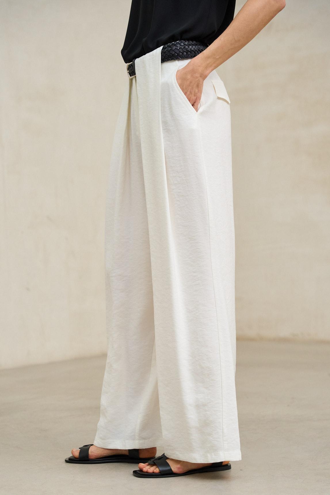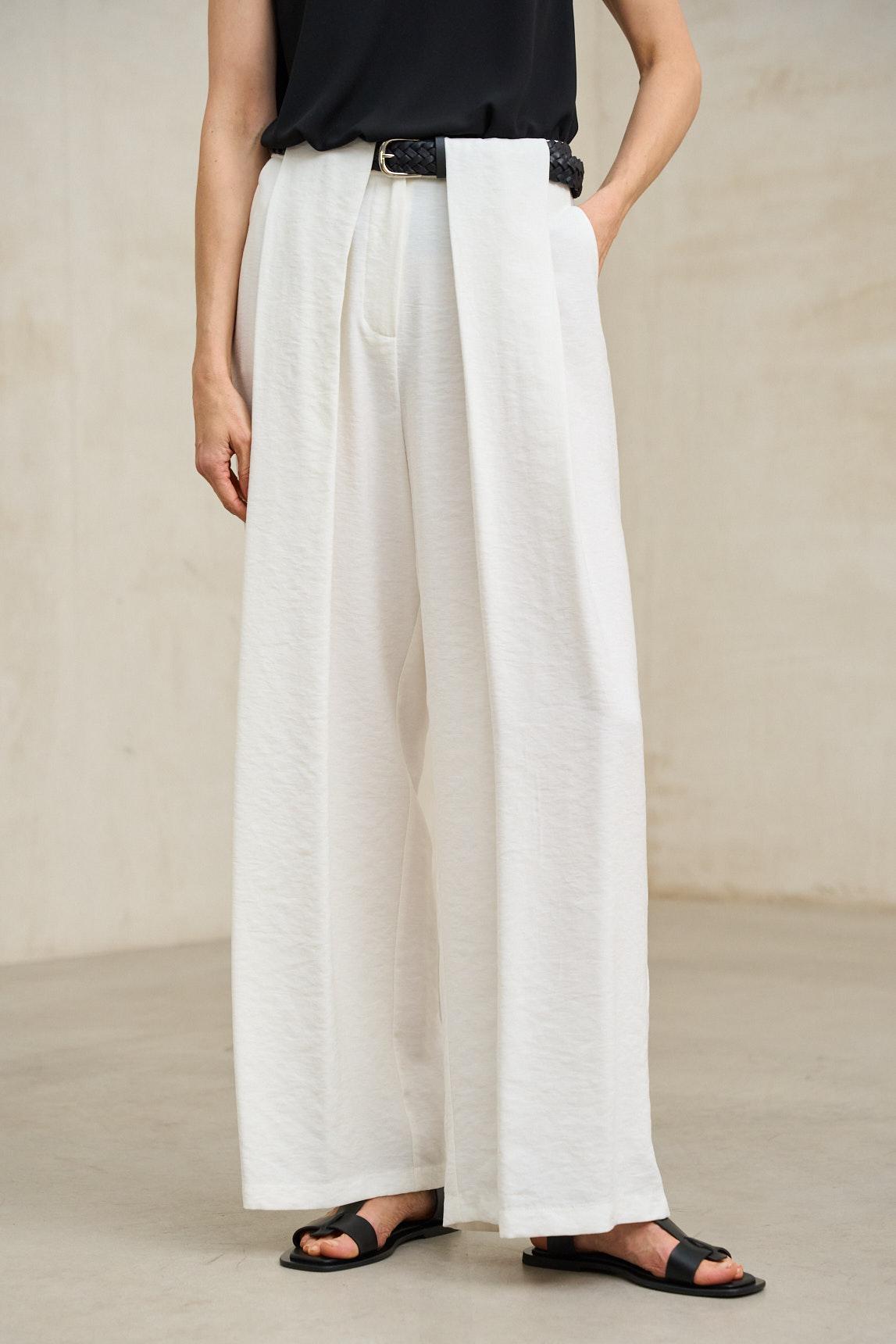 Este pantalón se define por una silueta amplia de líneas rectas y una caída fluida que acompaña el movimiento del cuerpo. Las pinzas frontales estructuran la prenda desde la cintura, aportando volumen sin rigidez. El cierre frontal con botón visible refuerza su diseño depurado, mientras que el tejido muestra una textura arrugada marcada y vertical que recorre toda la superficie, aportando interés visual y ligereza. Desde una lectura estilística, es una prenda versátil y contemporánea, pensada para crear looks relajados pero cuidados. Su fit amplio permite múltiples combinaciones, desde estilismos minimalistas hasta conjuntos más expresivos con capas y contraste de volúmenes. El tono blanco aporta frescura y luminosidad, facilitando combinaciones con tonos naturales, tierras y suaves. Pensado para un uso continuo, este pantalón se lleva con comodidad y naturalidad. Transmite sensación de calma y equilibrio, convirtiéndose en una pieza clave para construir looks claros, fluidos y coherentes a lo largo de la temporada. Nos esforzamos por mostrar los colores de la forma más fiel posible, pero pueden variar ligeramente respecto a la realidad.