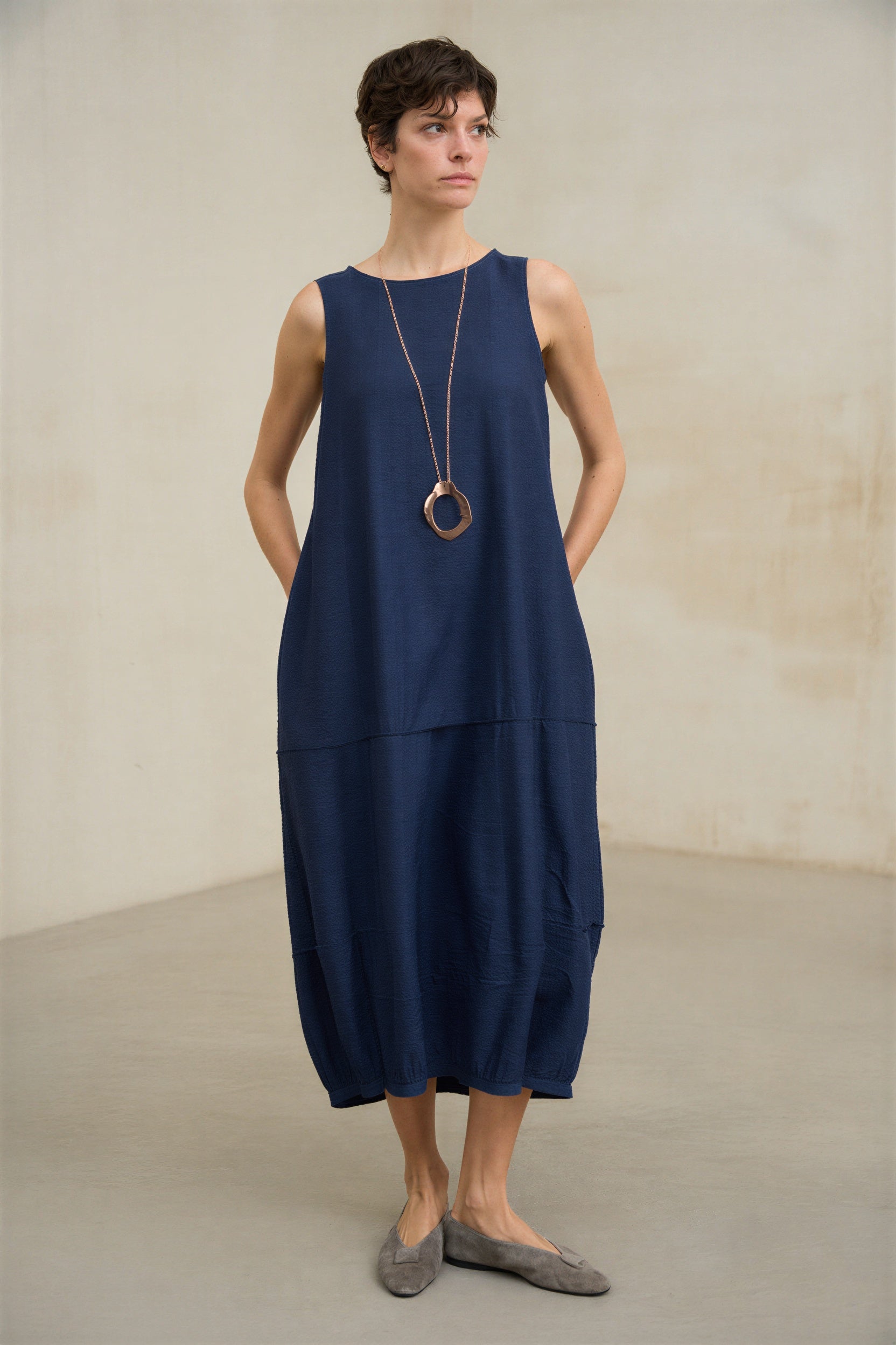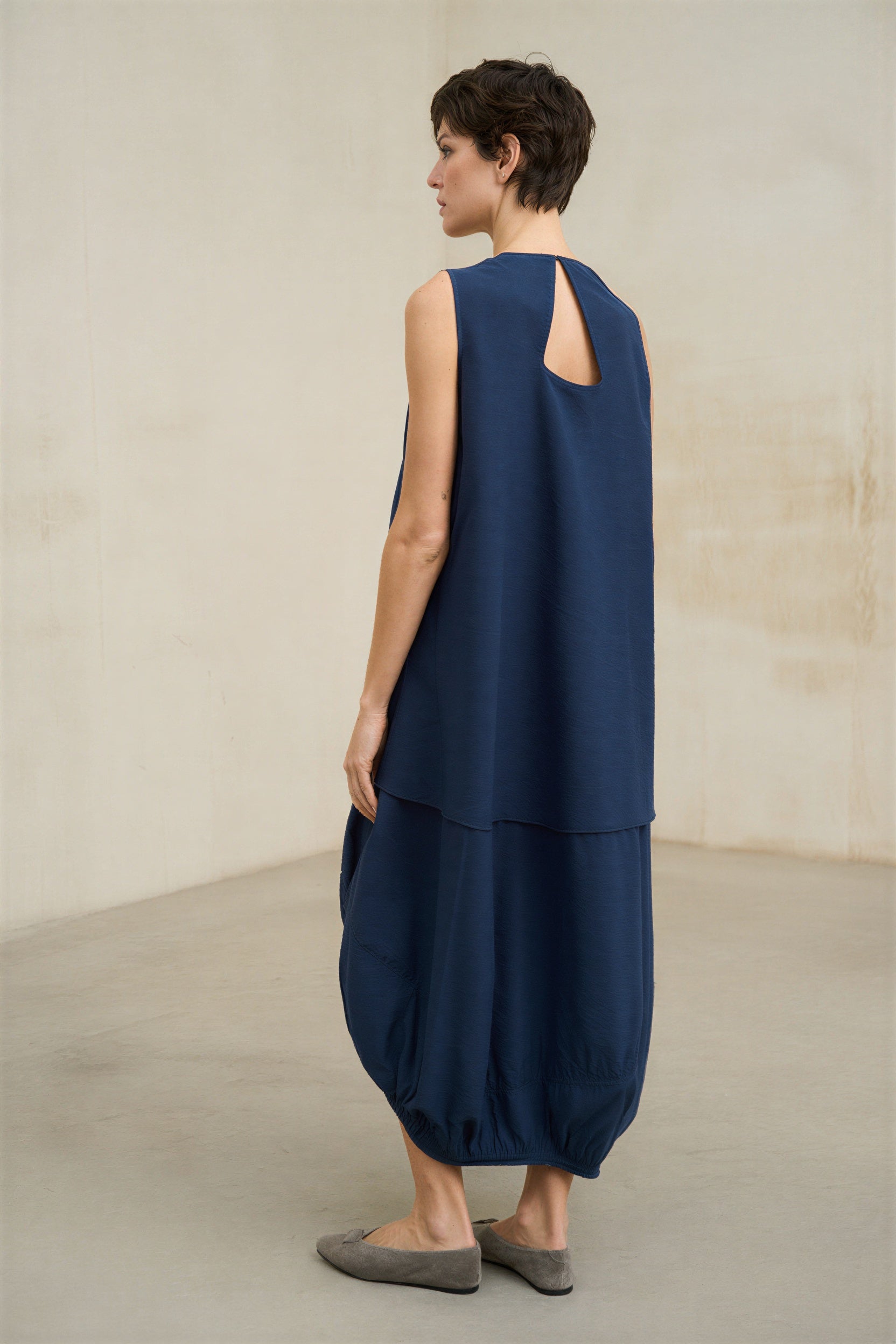 Navy blue women's dress with a round neckline, sleeveless design, and a wide silhouette with architectural inspiration. The design incorporates integrated side pockets and cuts that provide visual structure, while the balloon hem gathers the volume and creates an enveloping, modern, and very flattering shape. The surface has a smooth finish with a fluid drape, reinforcing a serene, sophisticated, and contemporary image.