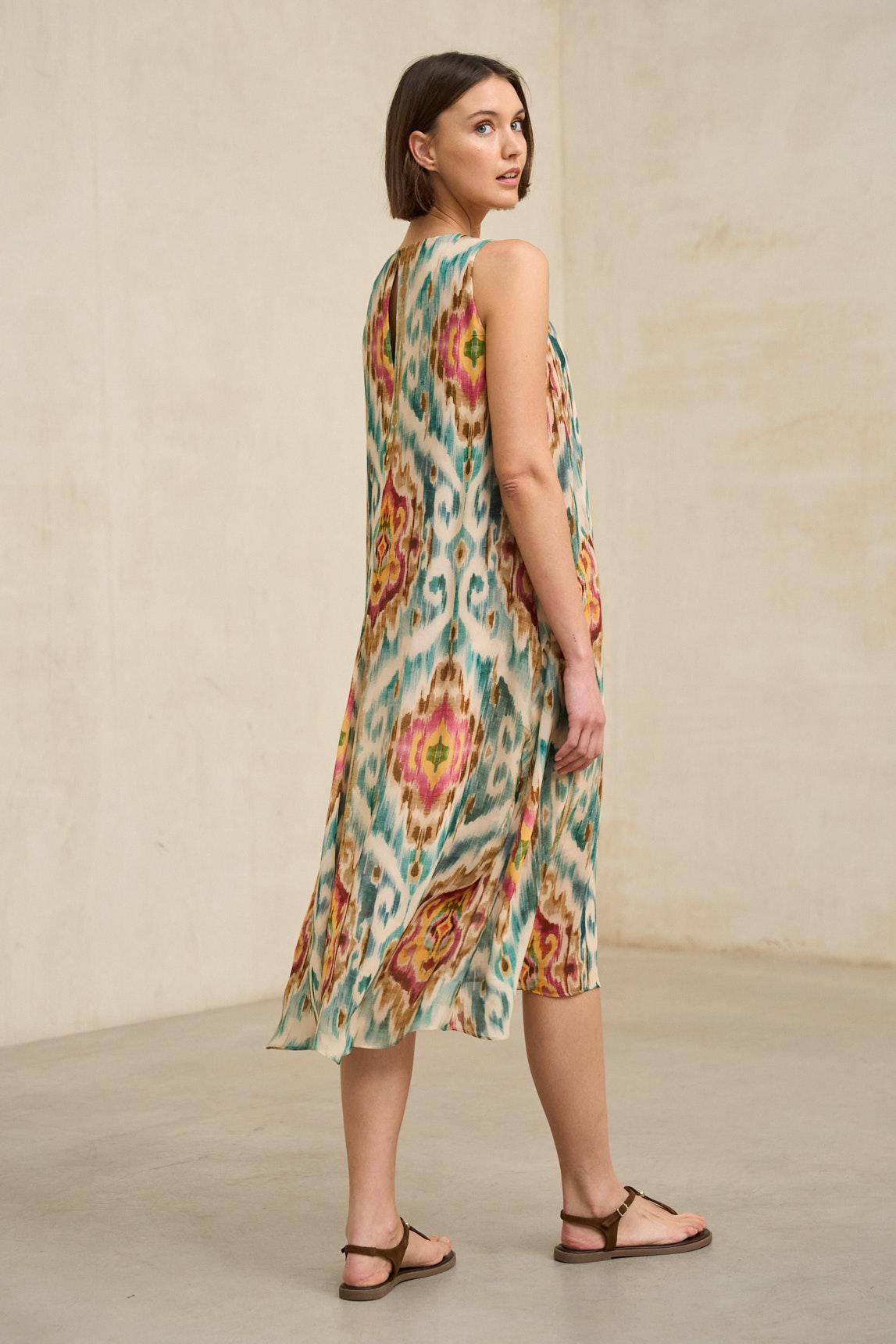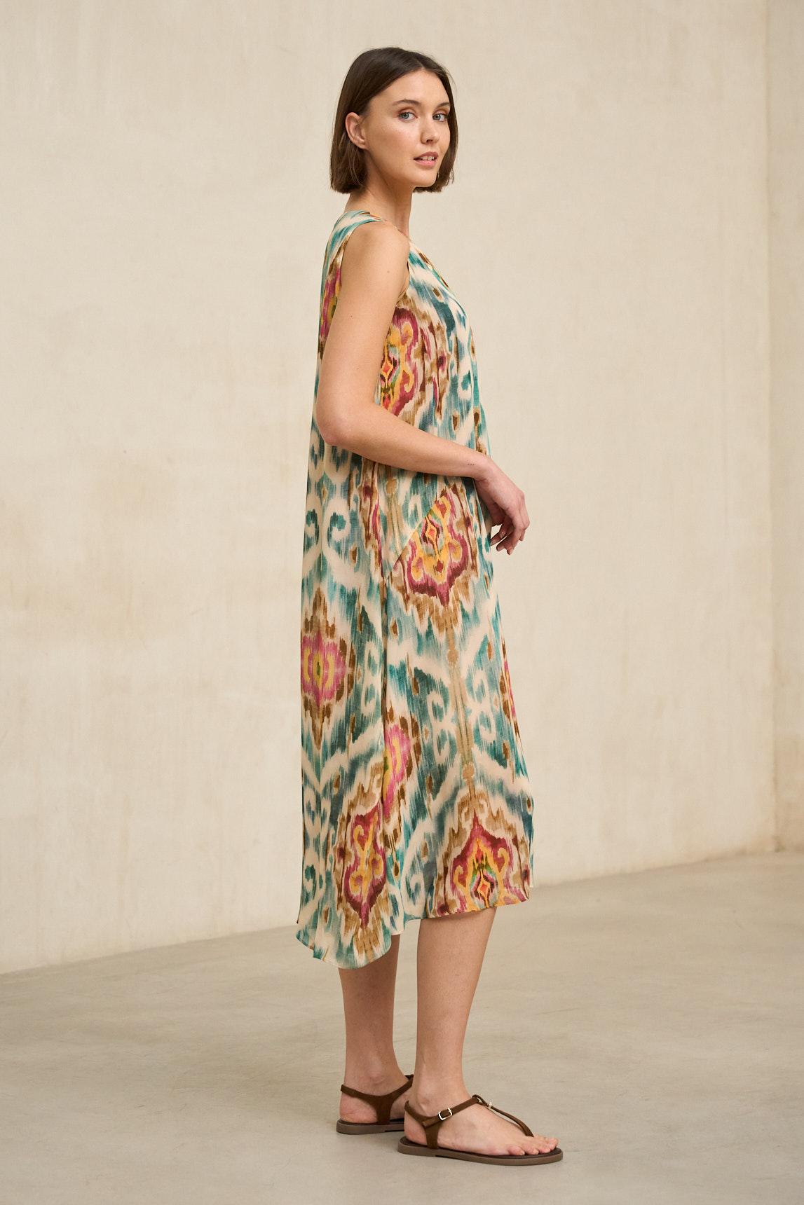 The printed Naïra dress maintains the fluid silhouette and minimalist design that define the style. With a V-neck and sleeveless cut, it features a loose, flowing structure that drapes naturally, creating movement and lightness as you walk.
