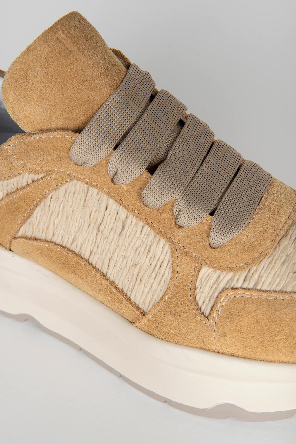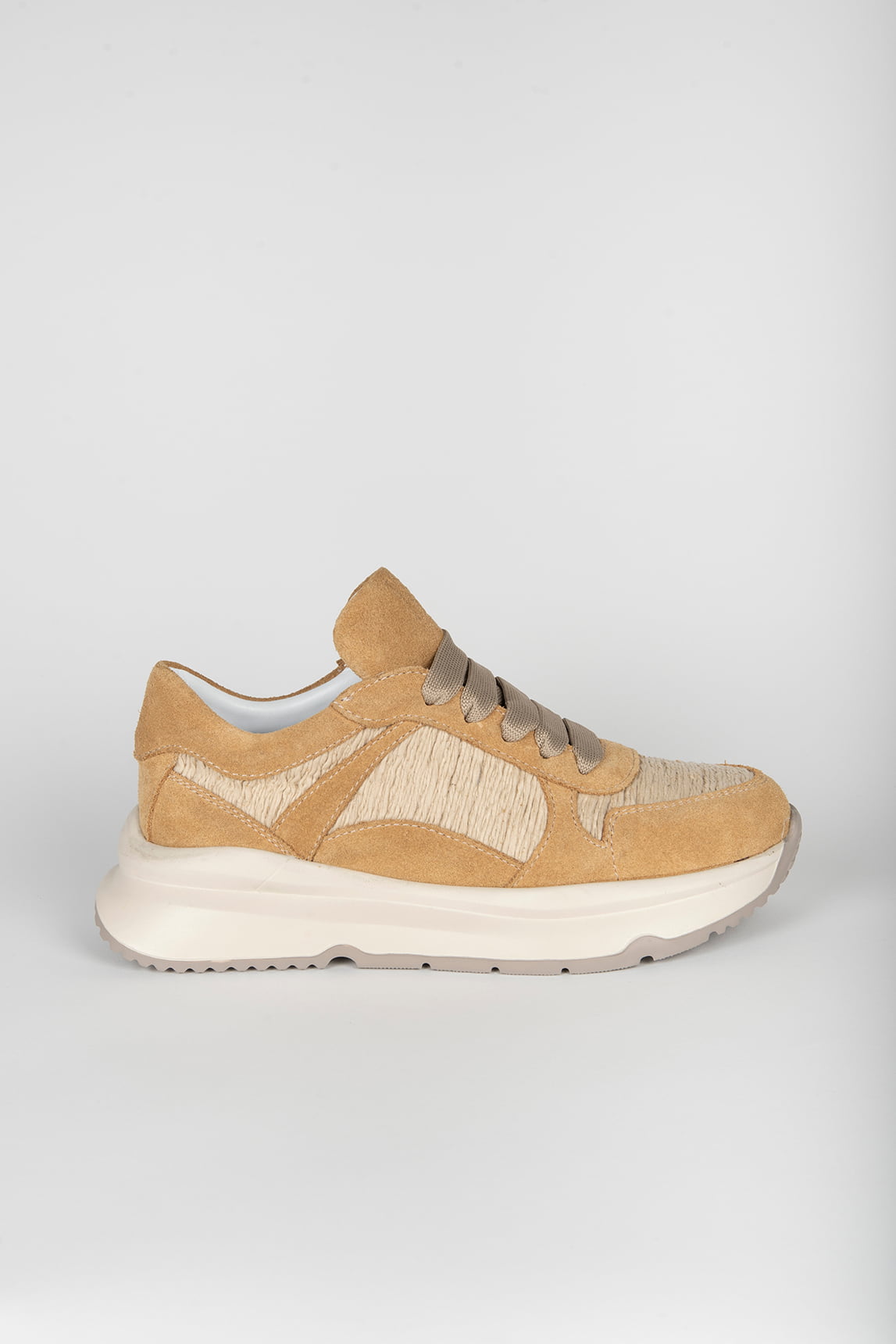 - Sneaker-style shoe in sand and beige tones.